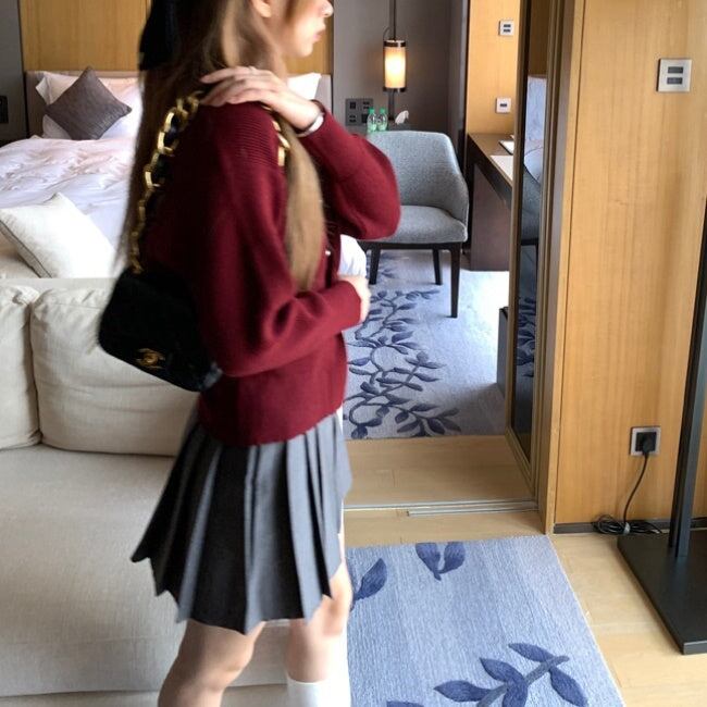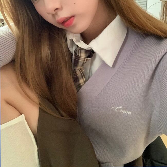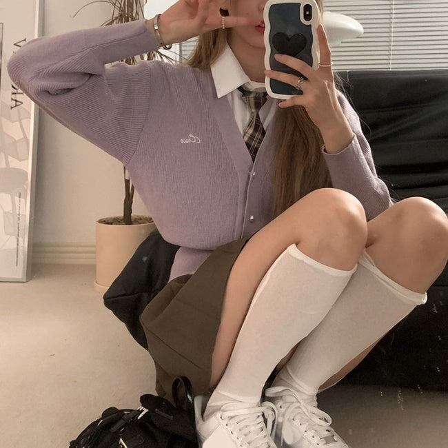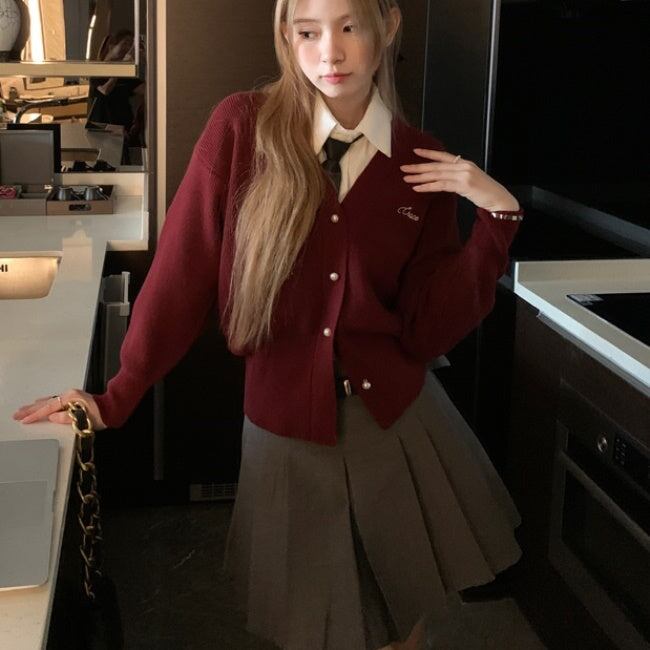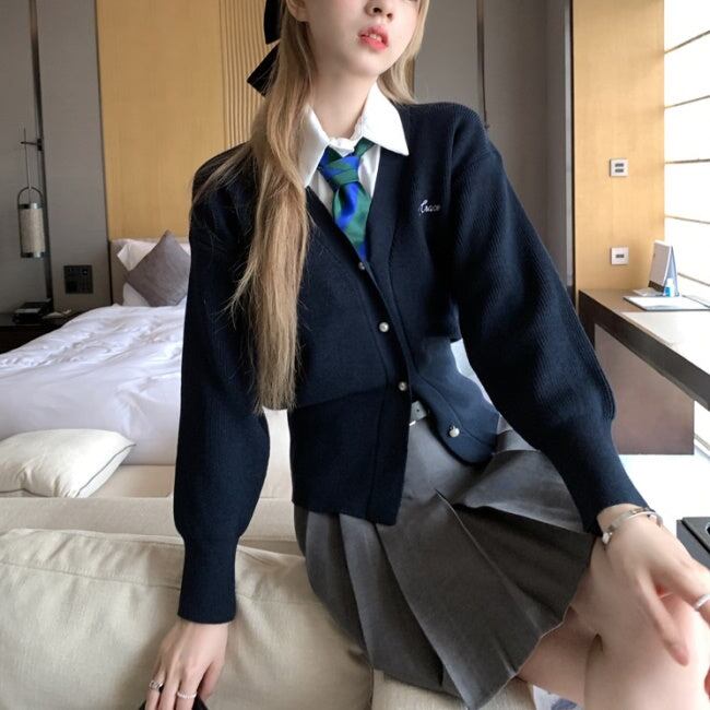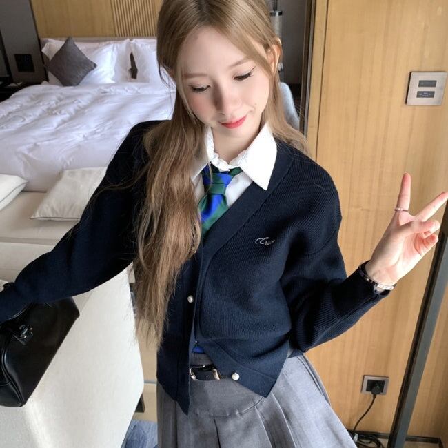 カーディガン ワンポイント レディース 韓国 ファッション パールボタン ロゴ Vネック 学生カーデ ショート丈 おしゃれ ニットソー カレッジスタイル プレッピーコーデ