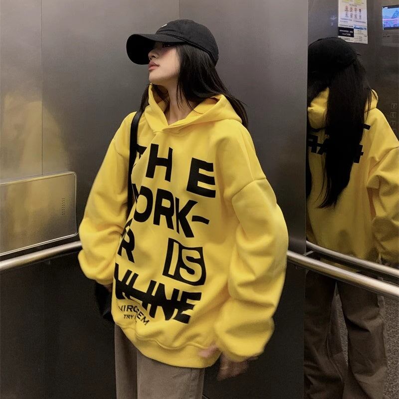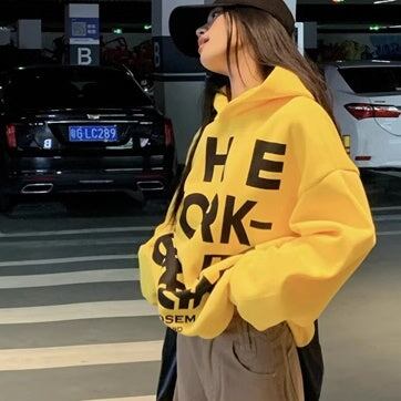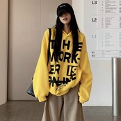ロゴ グラフィック ビッグ パーカー プルオーバー レディース 韓国 ファッション ロゴプリント イエロー フード スウェット トップス