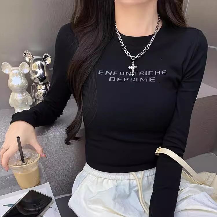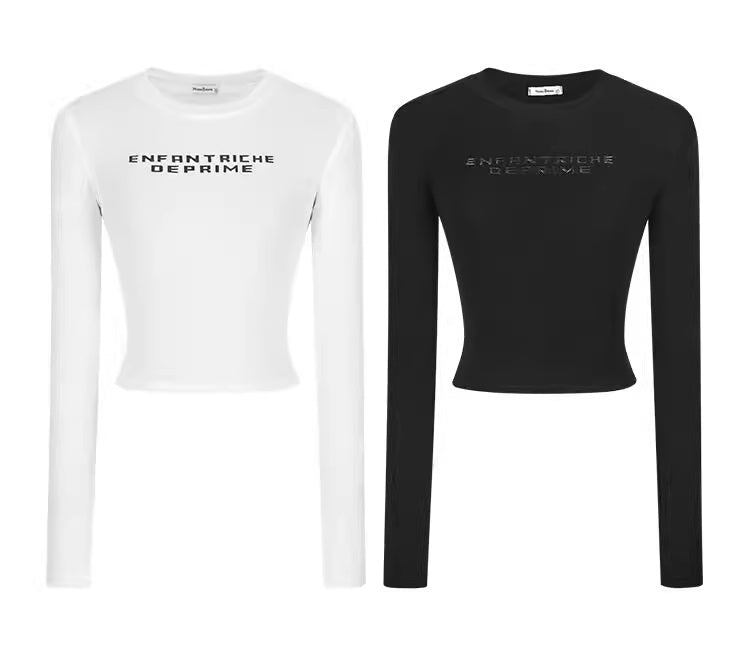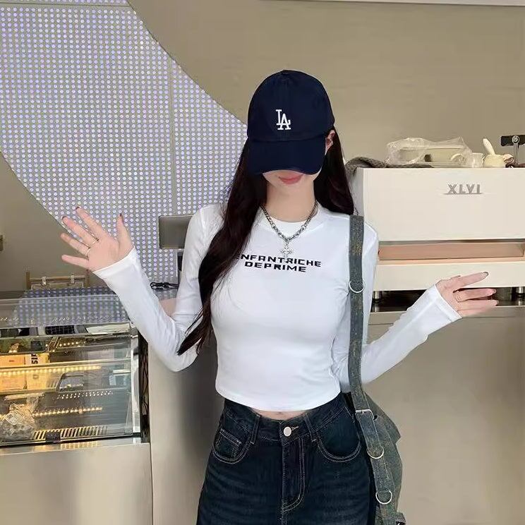 ロゴ タイト ロングTシャツ レディース 韓国 ファッション カットソー ストレッチ ロンT ミニマム クロップド ショート丈 タイトシルエット