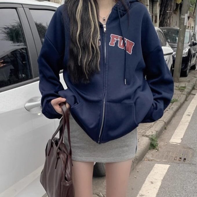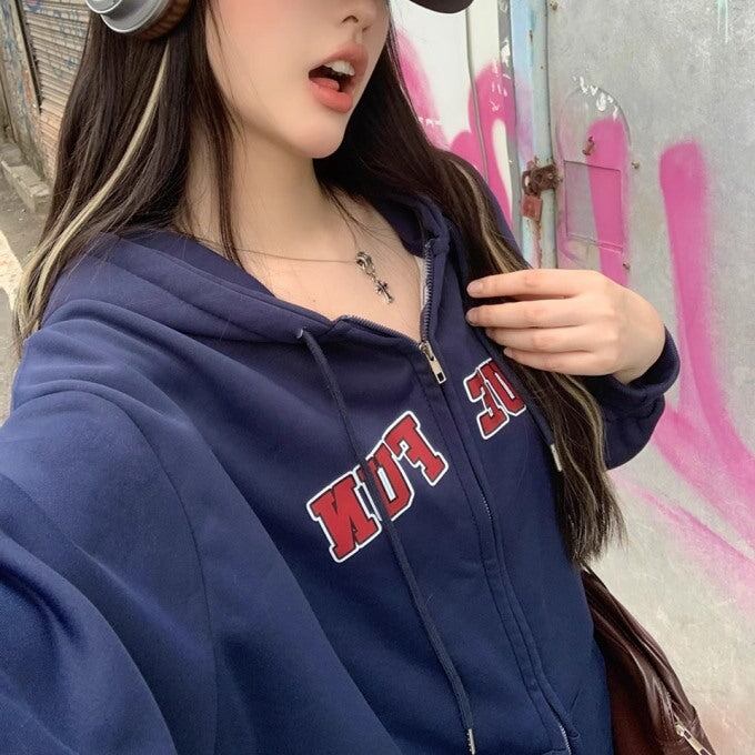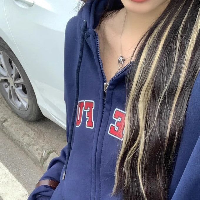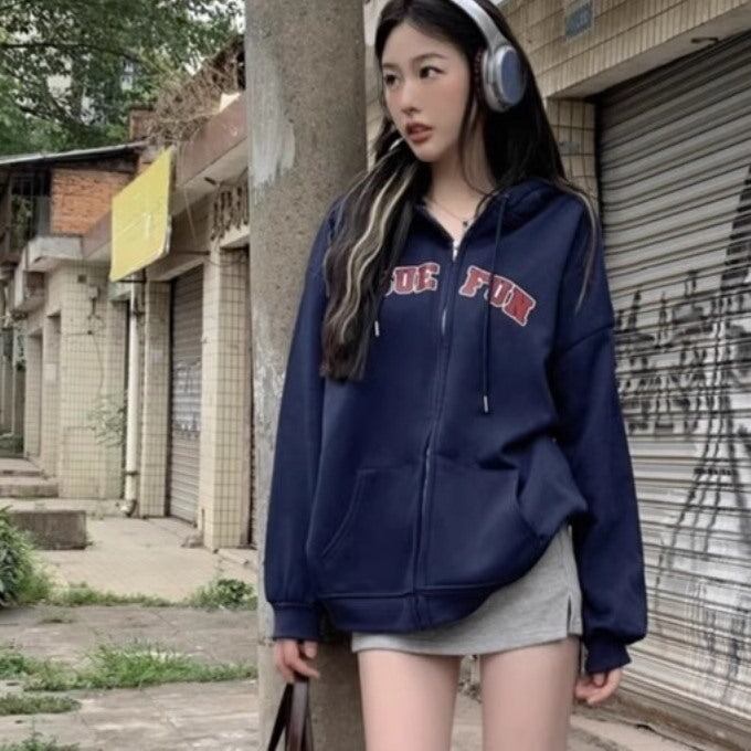 スウェットパーカー 長袖 レディース 韓国 ファッション ジップアップ ロゴパーカー 長袖 ネイビー ジャケット カジュアル フーディ 秋アウター