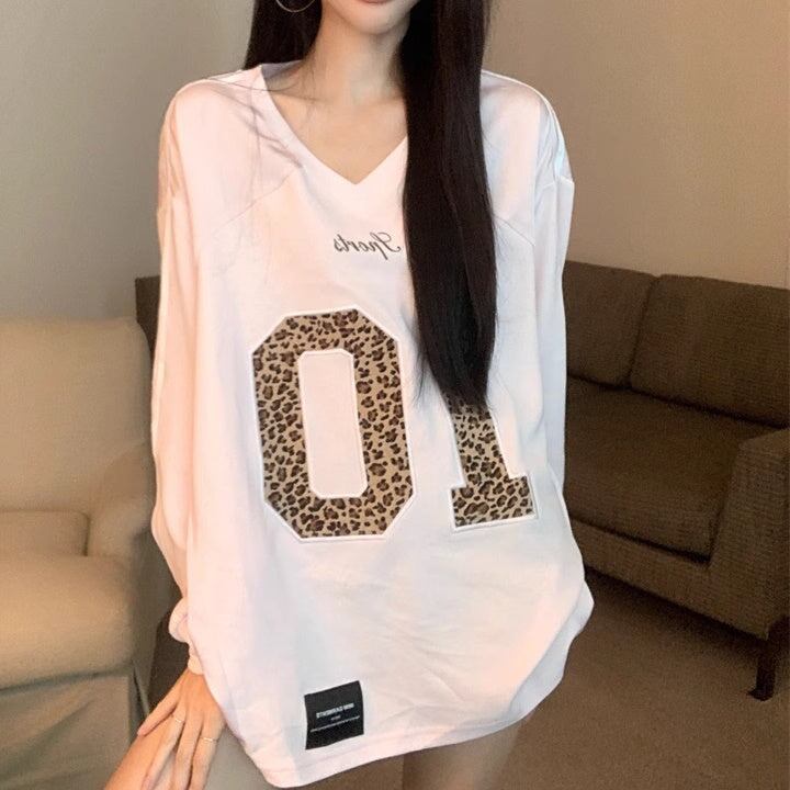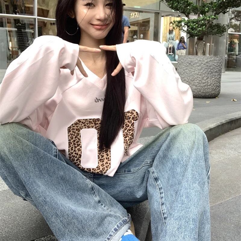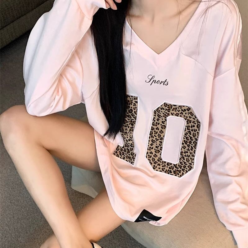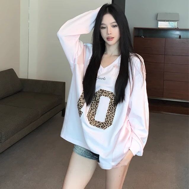 Tシャツ オーバーサイズ レディース 韓国 ファッション Vネック ナンバーロゴ レオパード ヒョウ柄 かわいい くすみカラー おしゃれ