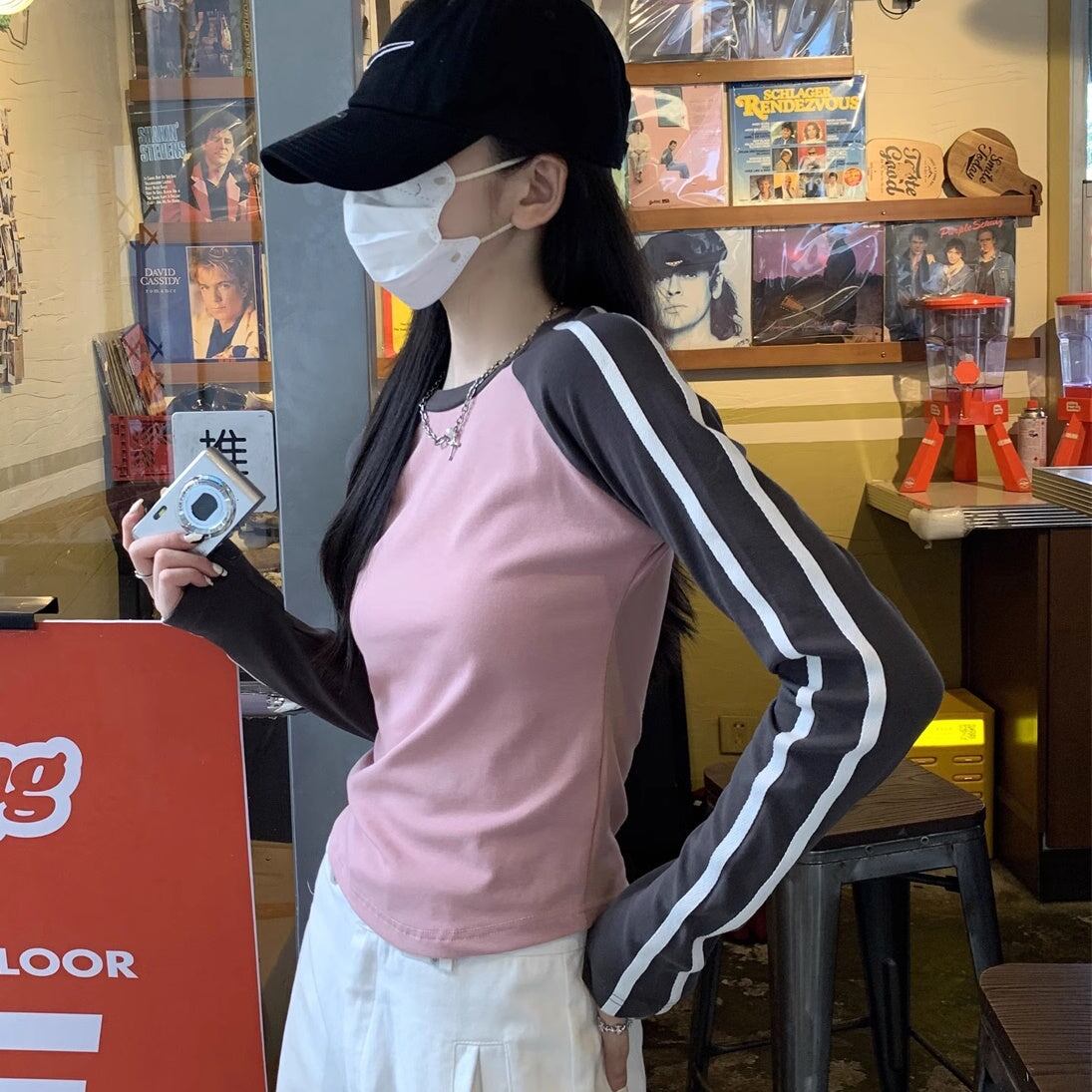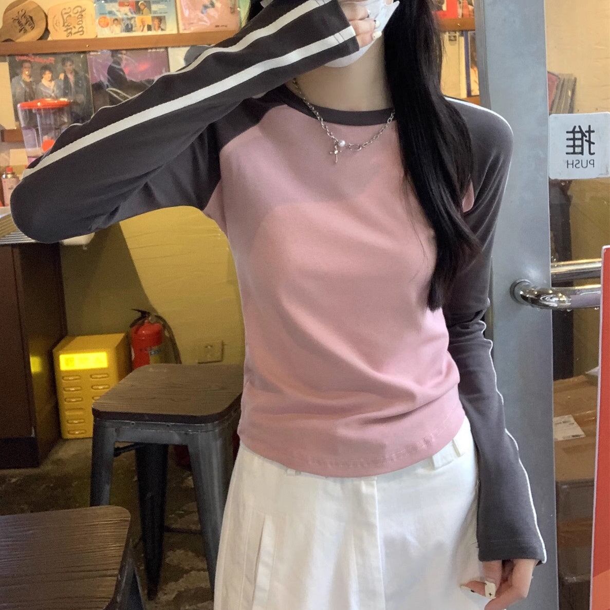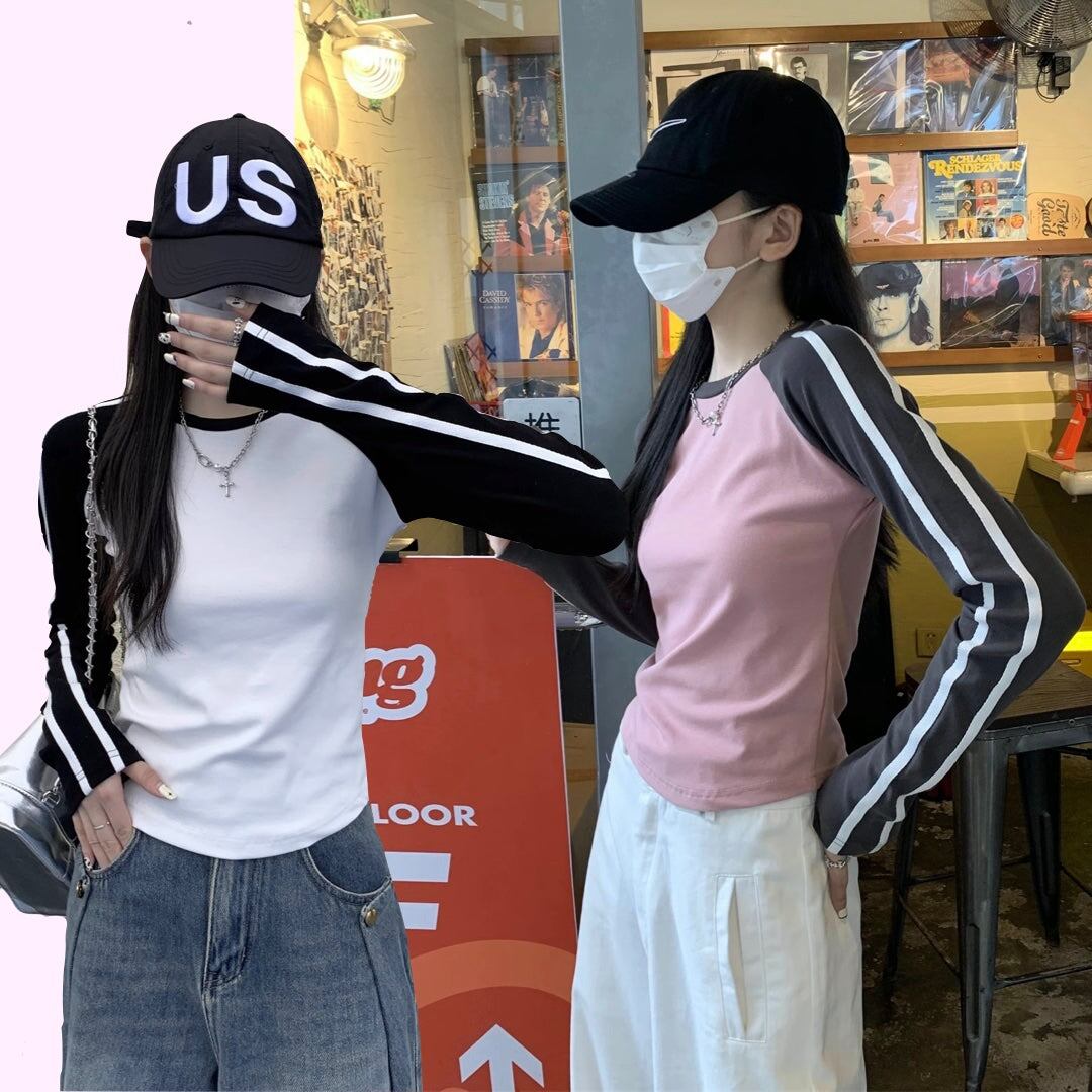 Tシャツ長袖 ラグラン レディース 韓国 ファッション ライン袖 ロング袖 おしゃれ コントラスト カラーブロック