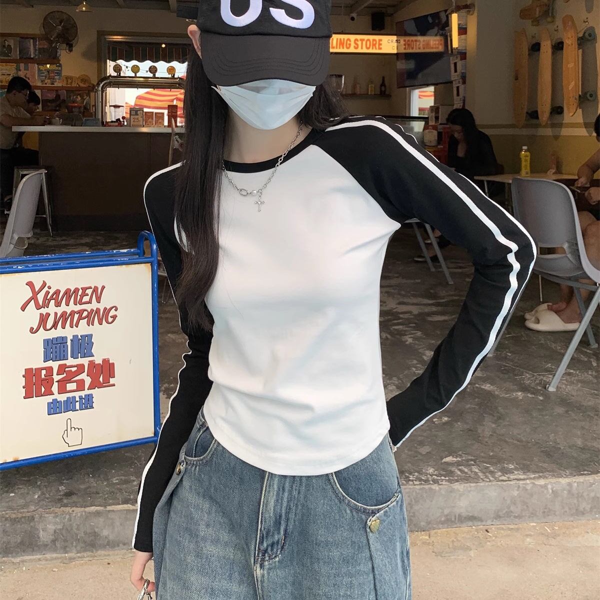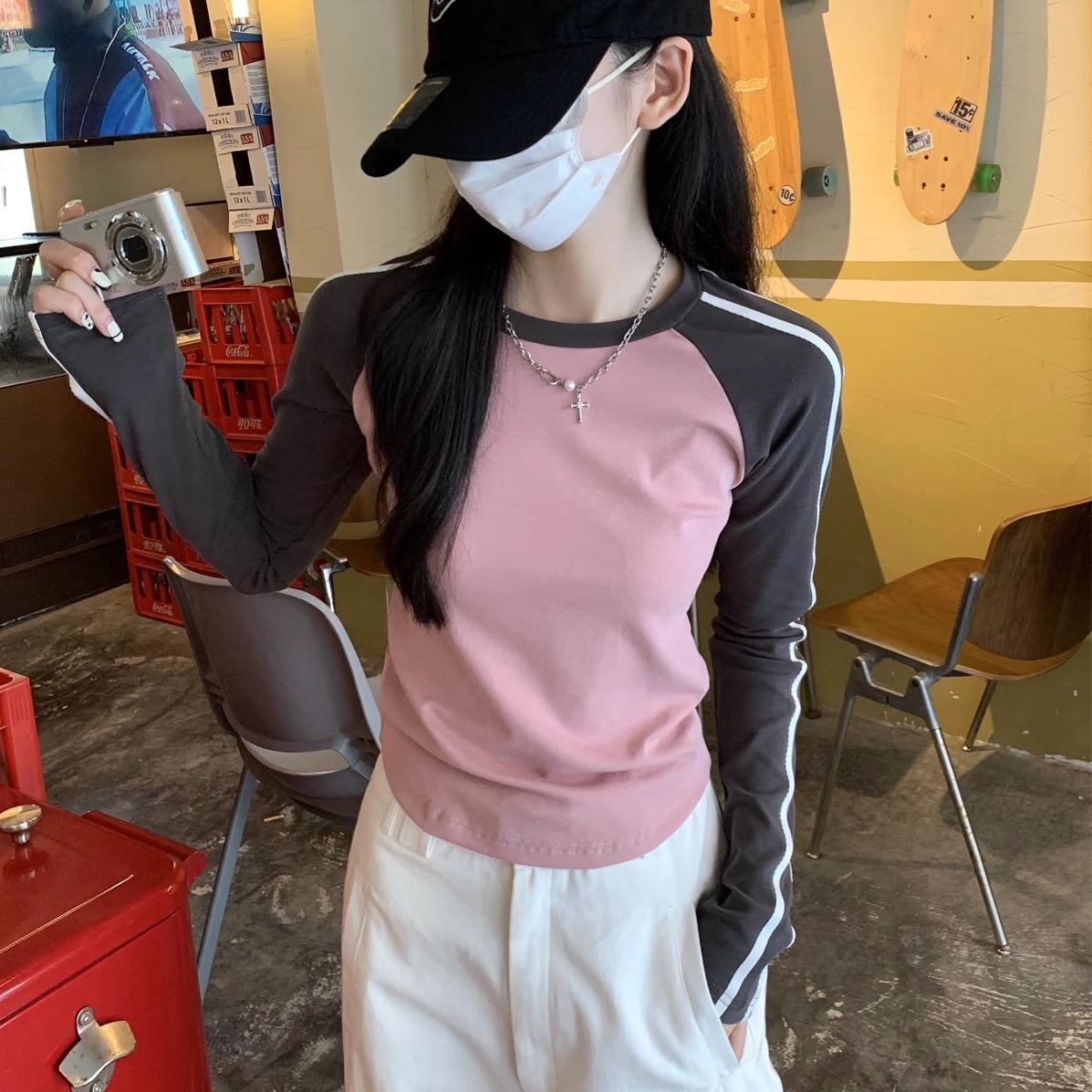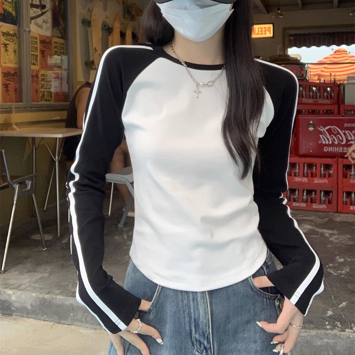 Tシャツ長袖 ラグラン レディース 韓国 ファッション ライン袖 ロング袖 おしゃれ コントラスト カラーブロック