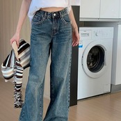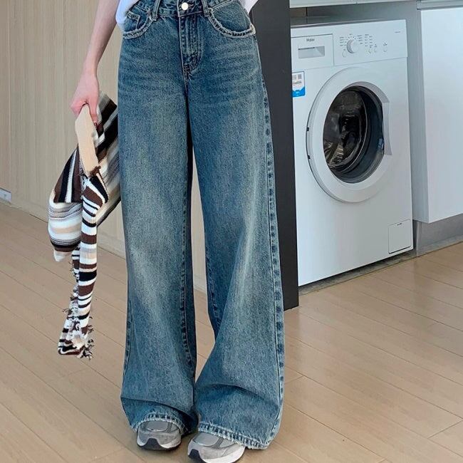デニムパンツ カジュアルジーンズ レディース 韓国 ファッション モップデニム ロングパンツ レトロ ストレート ワイド ユーズド加工 おしゃれジーンズ