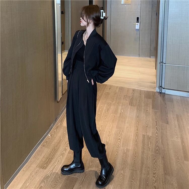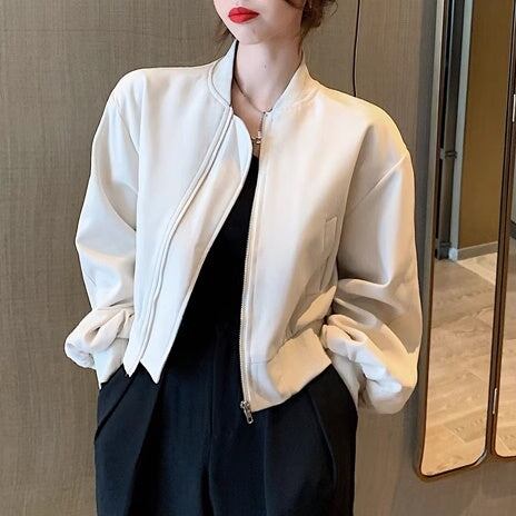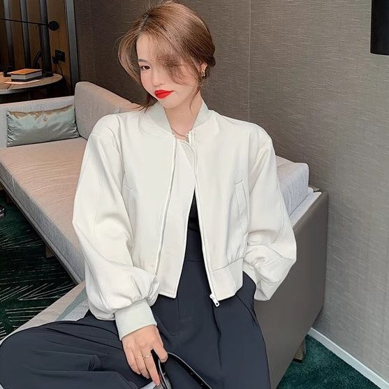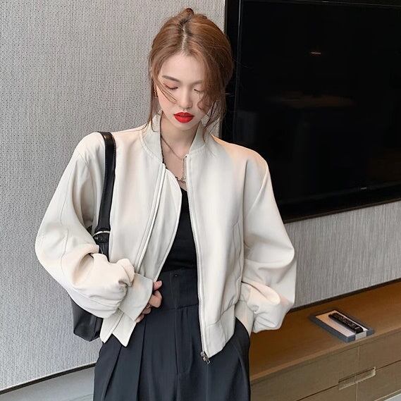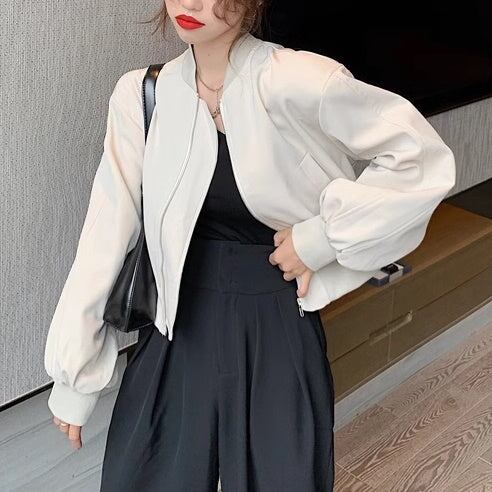 ジップブルゾン クロップドジャケット レディース 韓国 ファッション 春ジャケット ボリューム袖 無地 ノーカラ— ライトアウター
