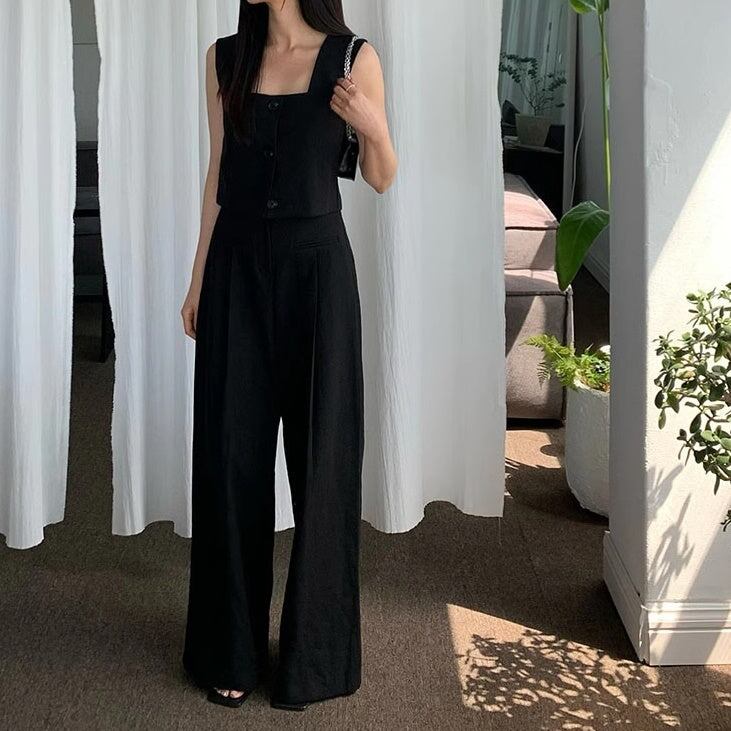パンツスーツ 夏セット レディース 韓国 ファッション ノースリーブ スクエアネック タンクトップ タックパンツ テーパード 夏スーツ