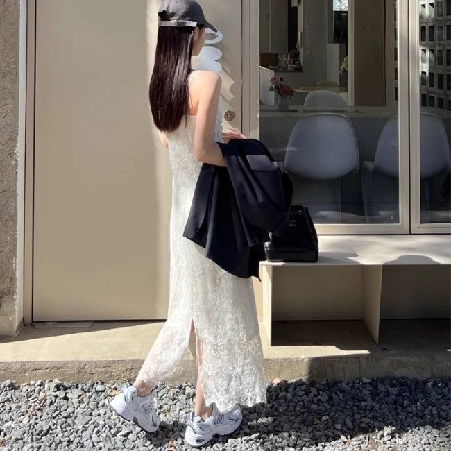 ワンピース レディース 韓国 ファッション キャミワンピ ノースリーブ 刺繍レース シアーメッシュ すけ感 バックスリット