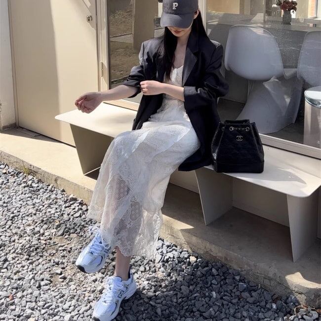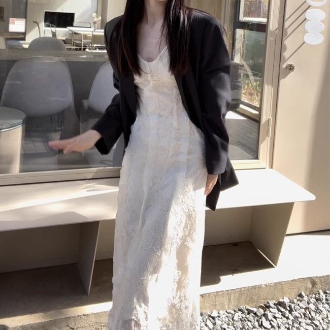 ノースリーブ ワンピース 韓国 キャミワンピ フリル 刺繍 レース シアーメッシュ ロングワンピース