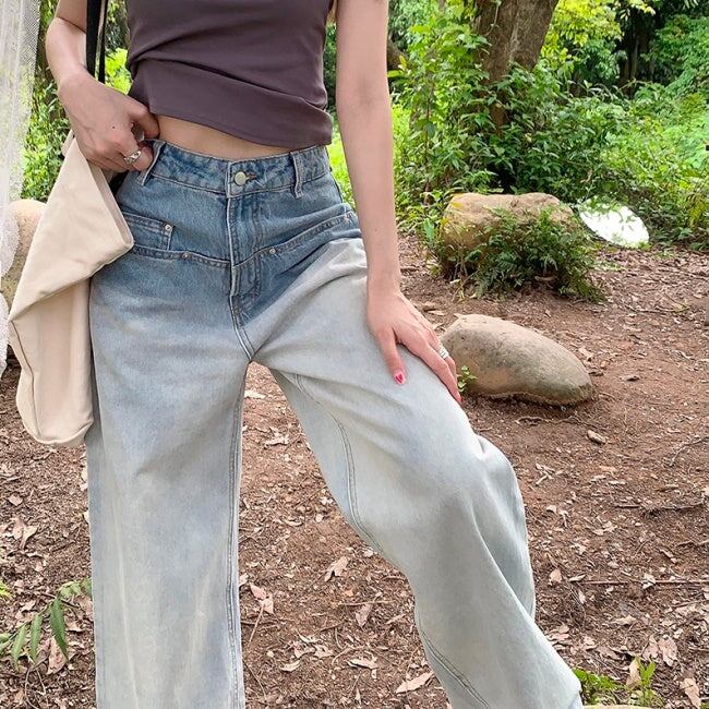 ハードウォッシュ デニム ワイドパンツ レディース 韓国 ジーンズ デニム モップパンツ グラデーション ルーズフィット パンツ