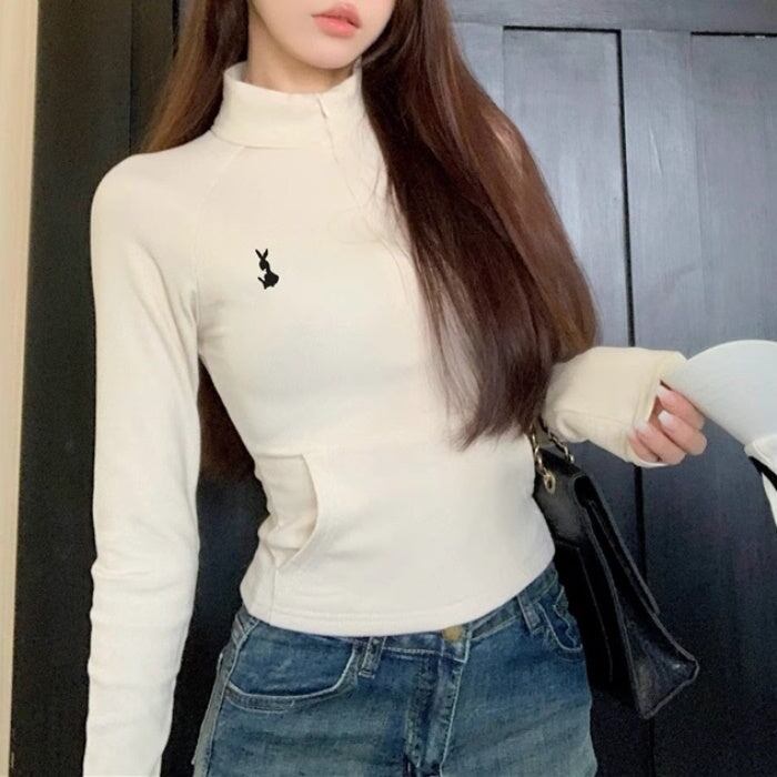 ハーフジップ ストレッチ ニット カットソー レディース 韓国 ハイネック 長袖 フロントポケット リブニット
