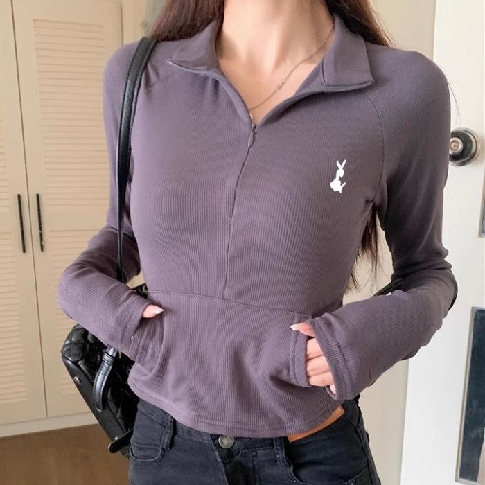 カットソー ハーフジップ レディース 韓国 ファッション ハイネック 長袖 フロントポケット Vネック 2way ストレッチ トップス