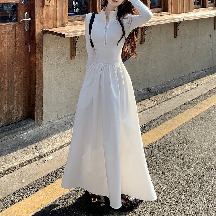 ワンピース 切り替え 異素材 レディース 韓国 ファッション ハイネック ハーフジップ フレア Aライン ロングマキシ 長袖 エアリー