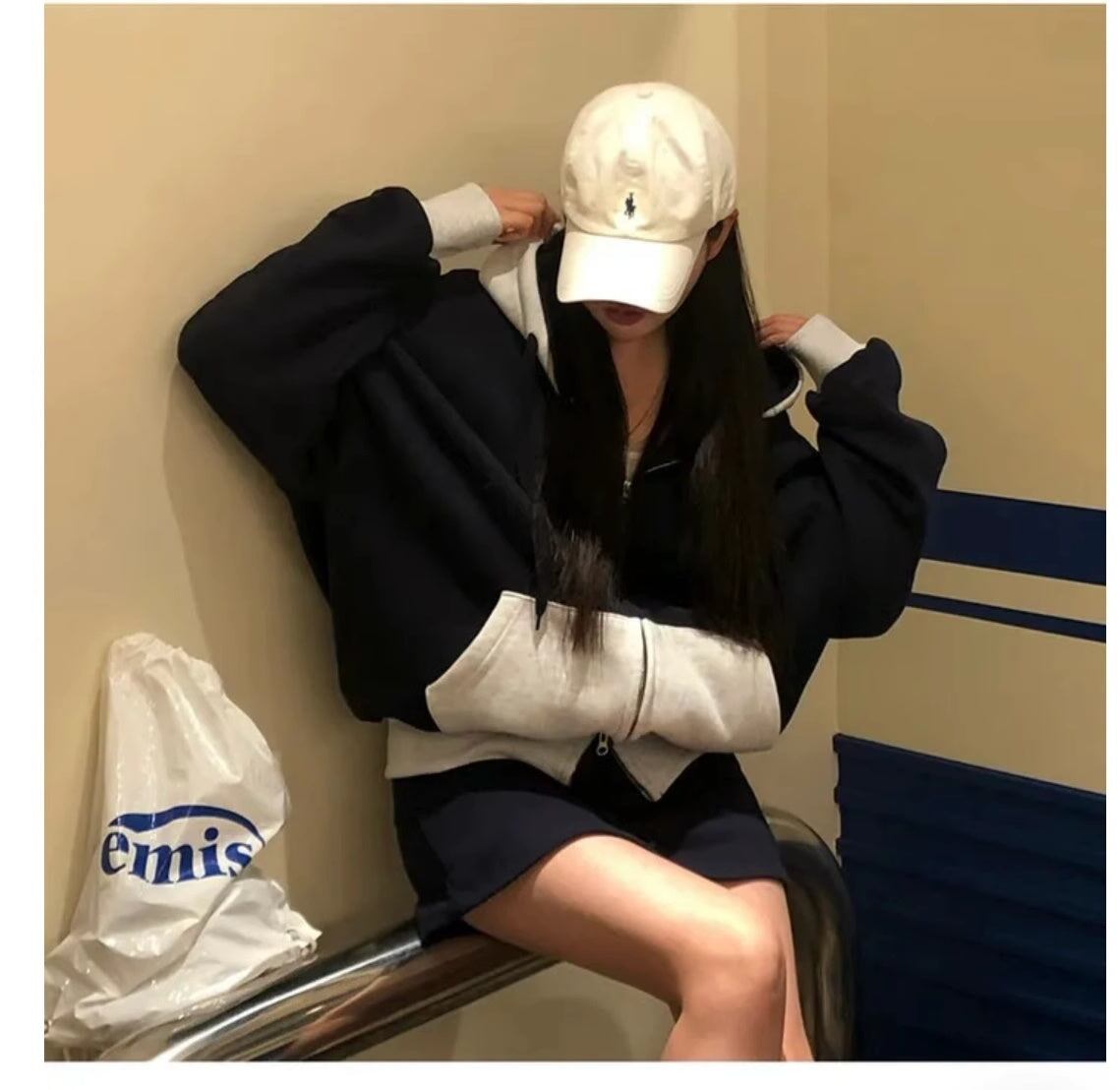 バイカラー ジップ パーカー レディース 韓国 カジュアル ファッション オーバーサイズ フーディ 秋冬 トップス