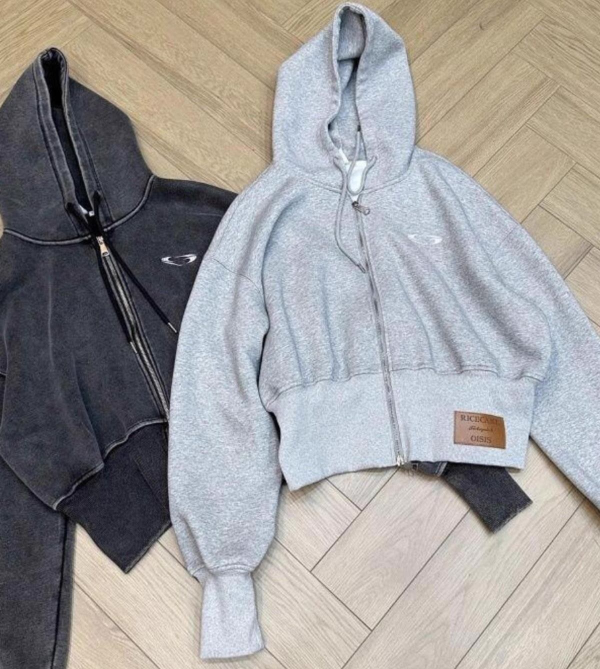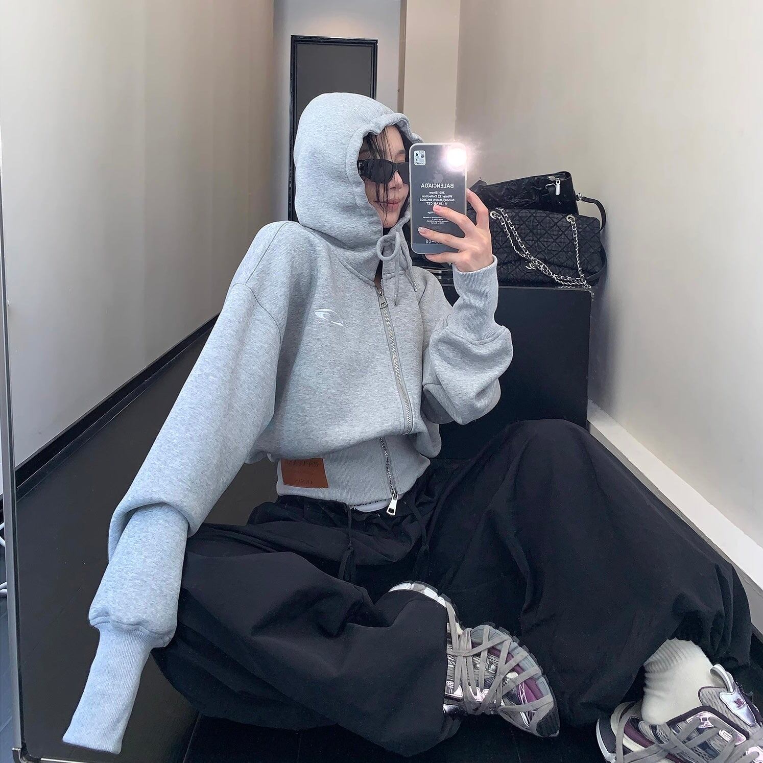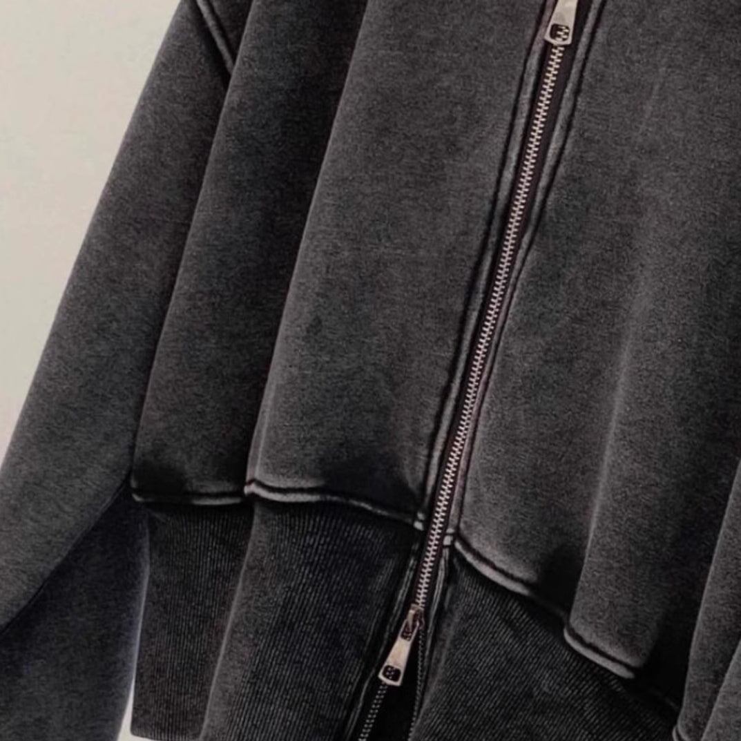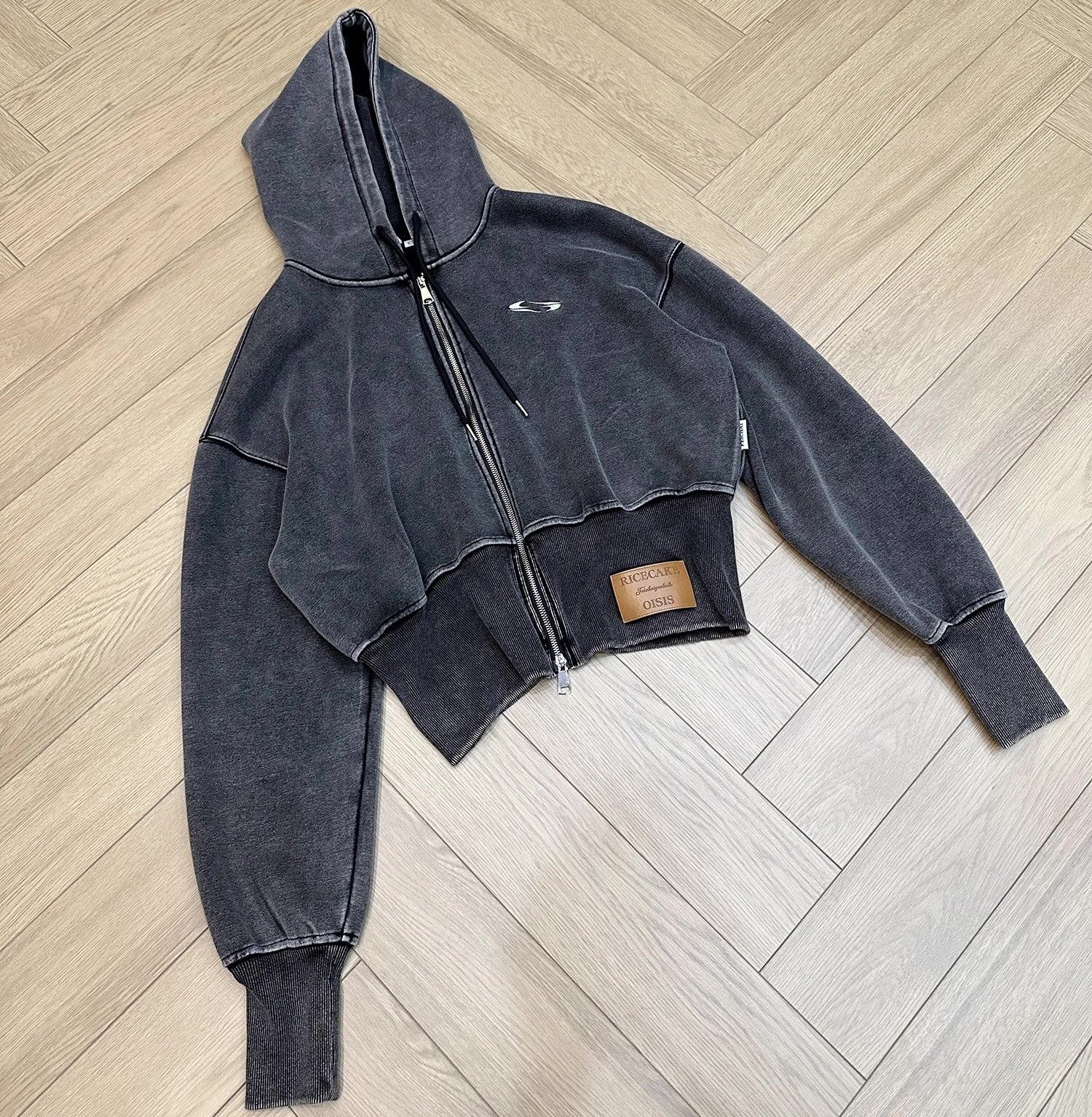 パーカー ビンテージ加工 レディース 韓国 ファッション ダブルジップ 色褪せ加工 フードジャケット クロップド丈 ショート丈 メンズライク アッシュカラー