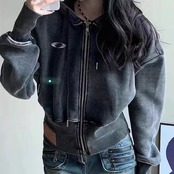 パーカー レディース ビンテージ加工 韓国 ファッション ダブルジップ クロップド丈 ショートフーディ