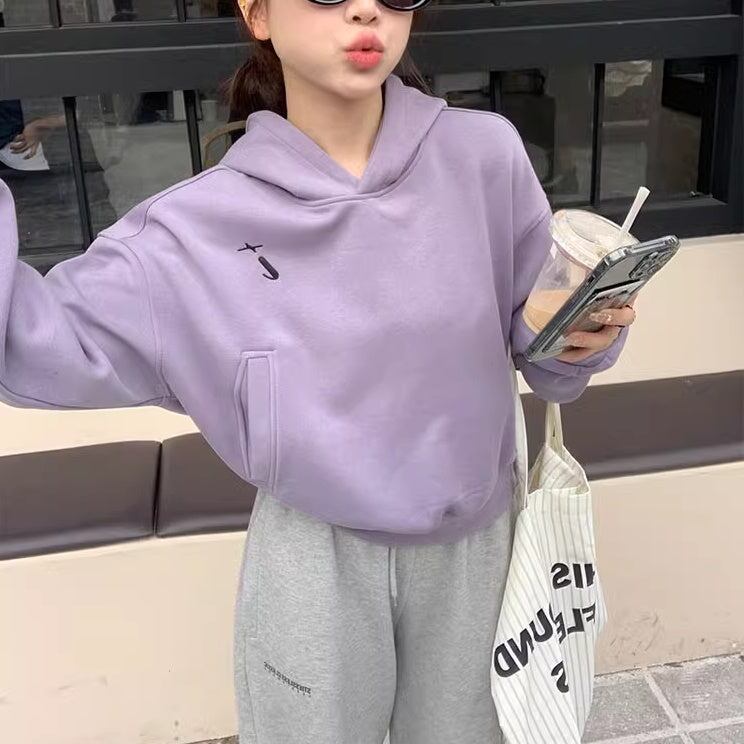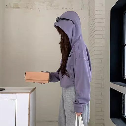 スウェットパーカー レディース 韓国 ファッション プルオーバー パープル ワンポイント ショート丈 フード 厚手 裏起毛
