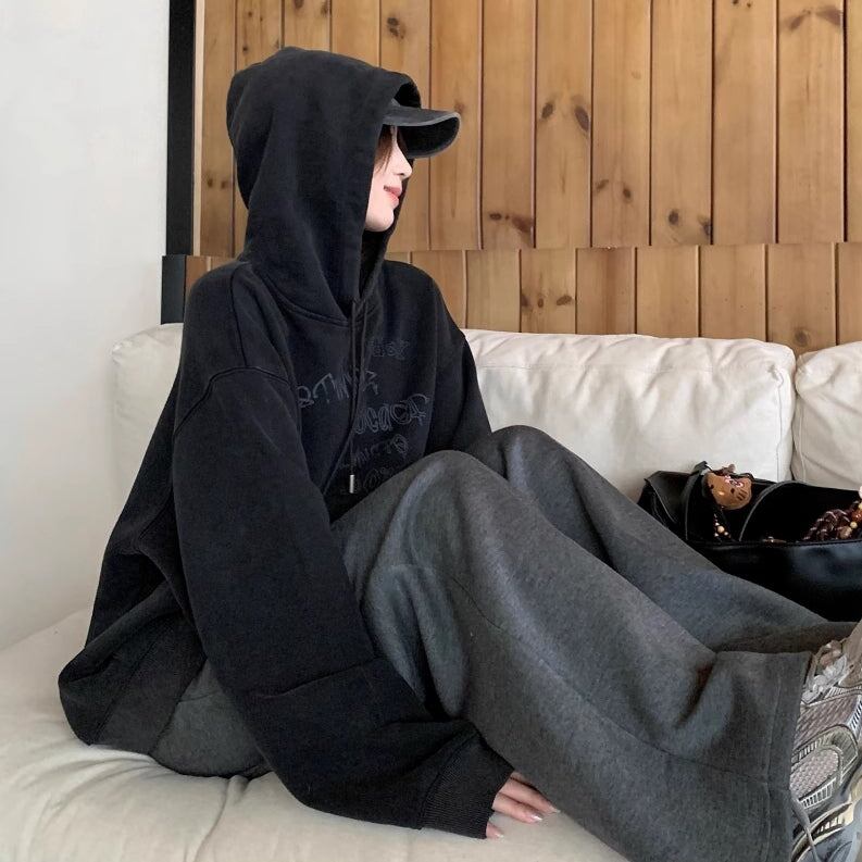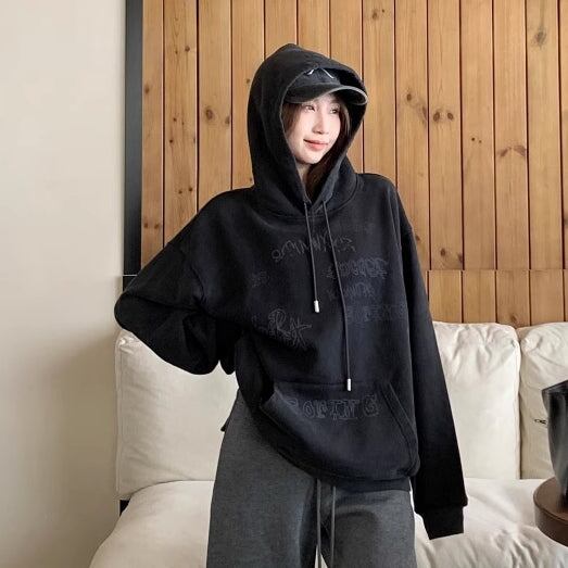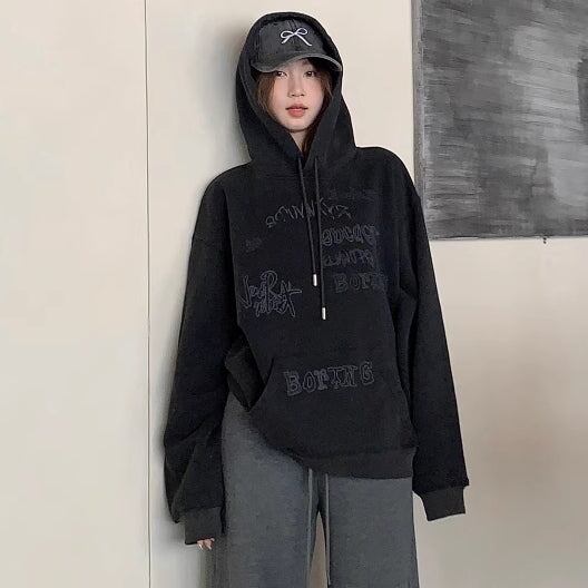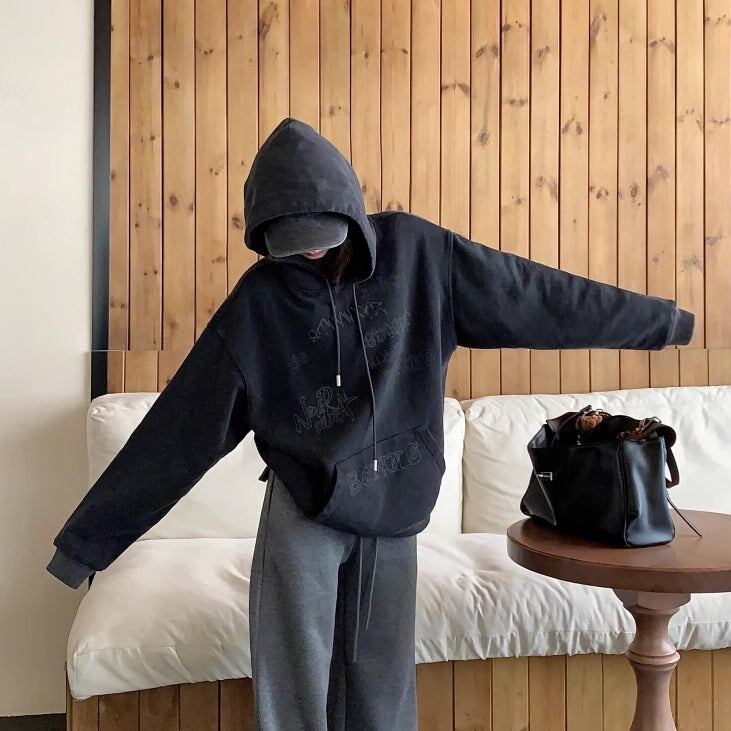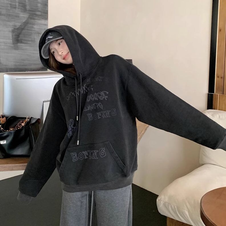 パーカー プルオーバ— レディース 韓国 ファッション 落書きロゴ シンプル おしゃれ 黒パーカー アッシュブラック ビンテージ 色あせ加工