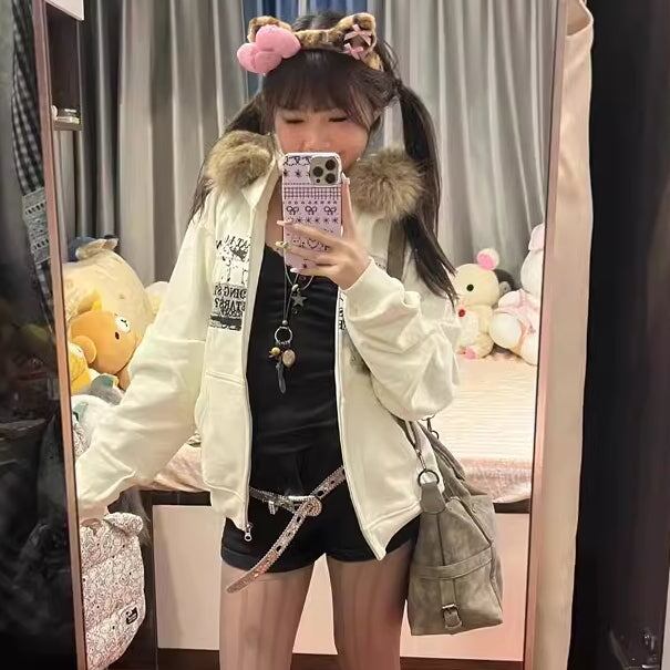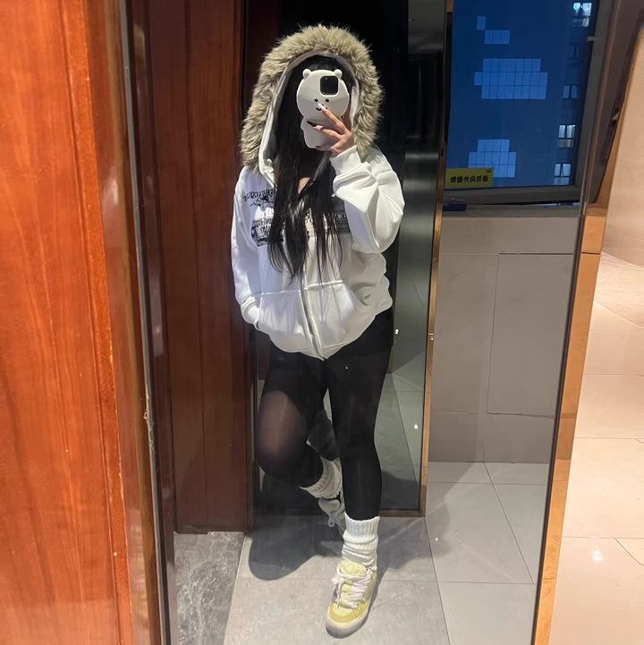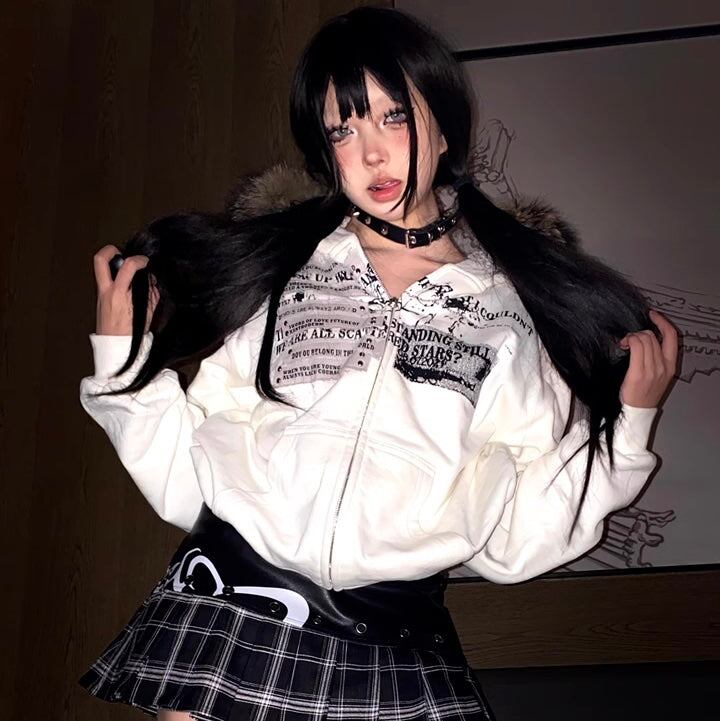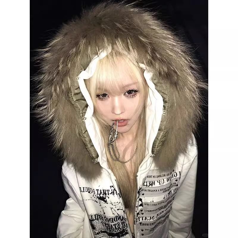ファーフード パーカー レディース 韓国 ファッション スウェット ロゴプリント ゴシック ストリート フーディー