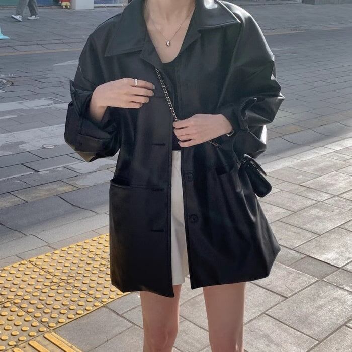 フェイクレザー レディース 韓国 ファッション ロングジャケット 大人カジュアル アウター シック レイヤード おしゃれ