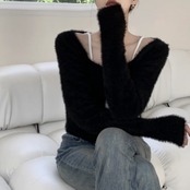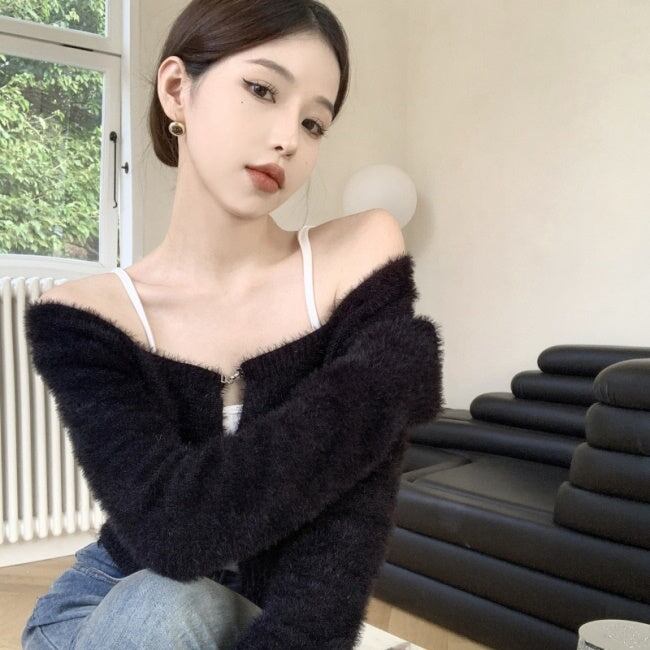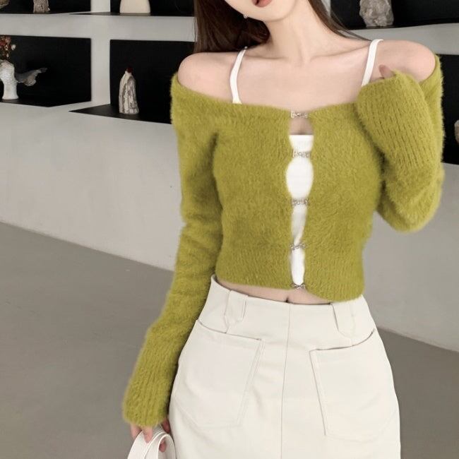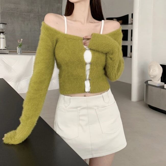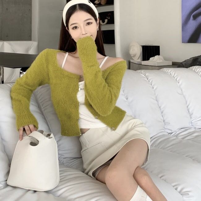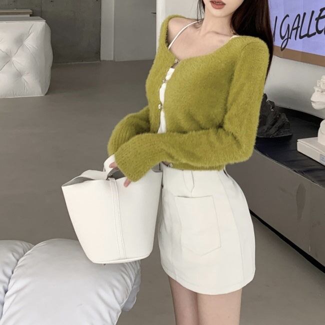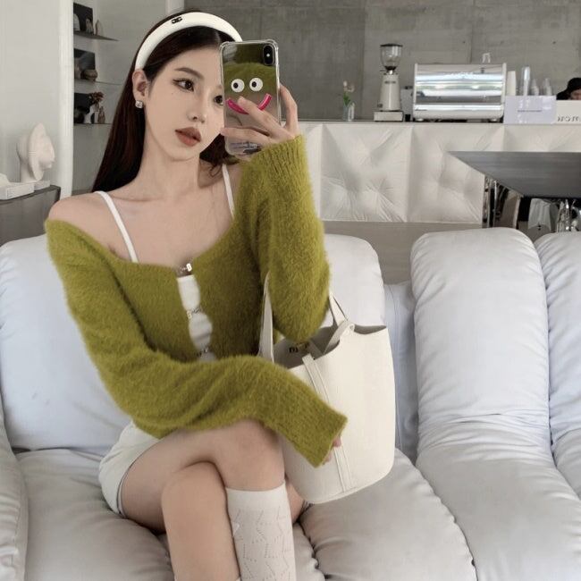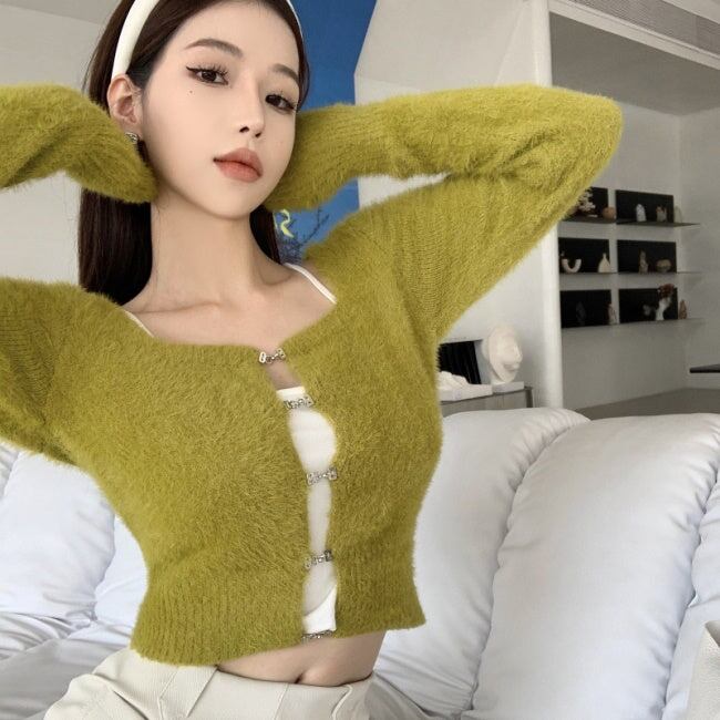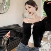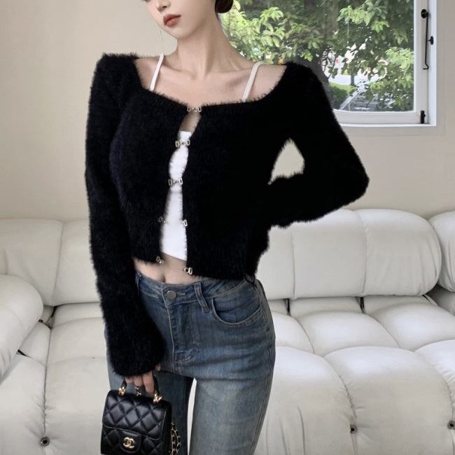 ニット カーディガン ショートトップス レディース 韓国 ファッション 毛足ニット ショートカーディガン 黒 グリーン スクエアネック ミニマムトプス 秋冬ac07030