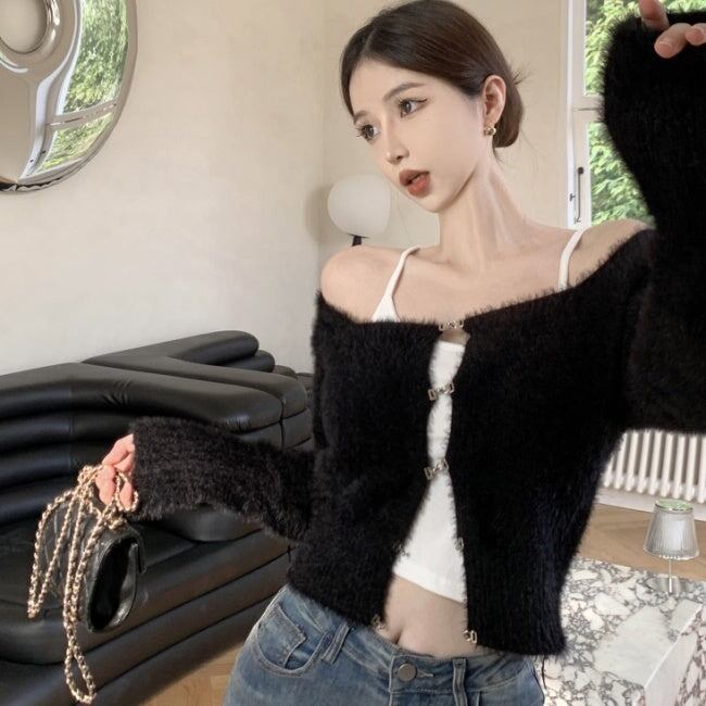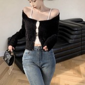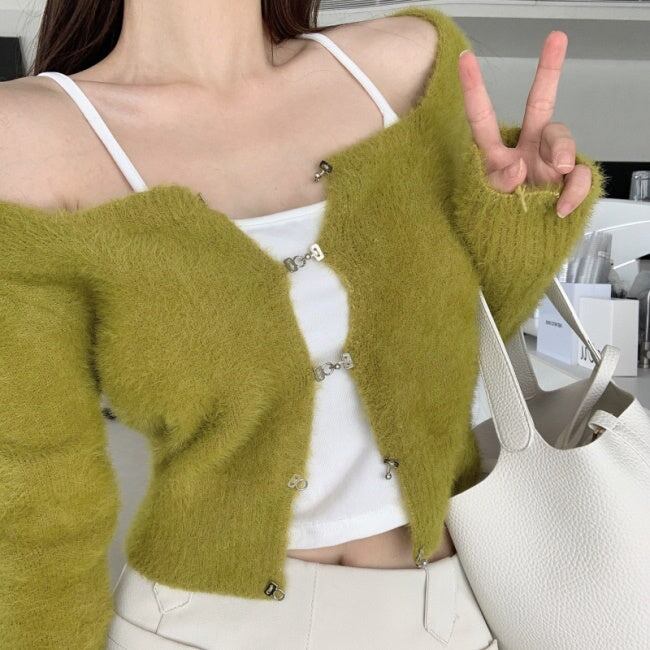 フックボタン ショート ニットカーディガン 韓国 ファッション 毛足ニット クロップド ニット トップス 秋冬