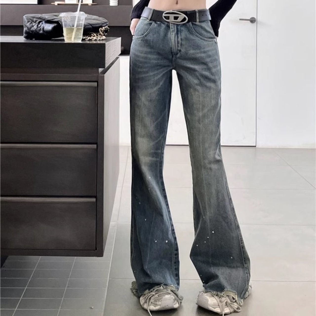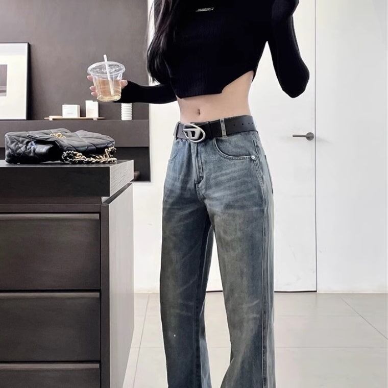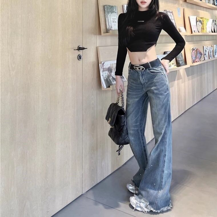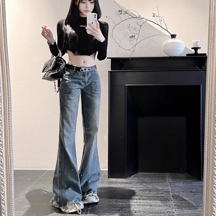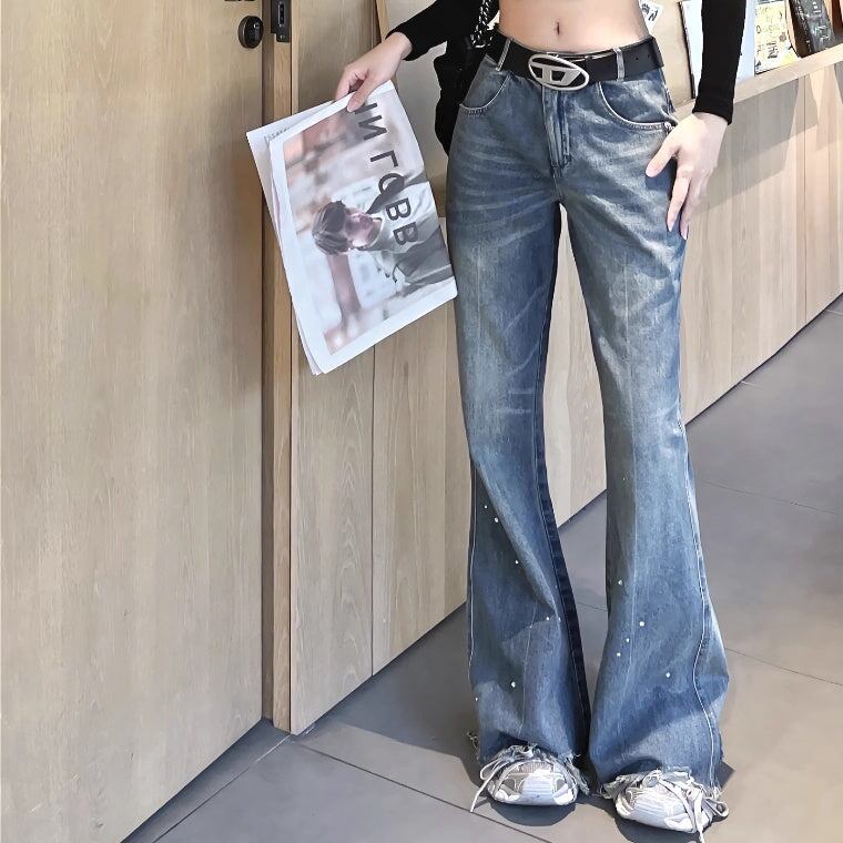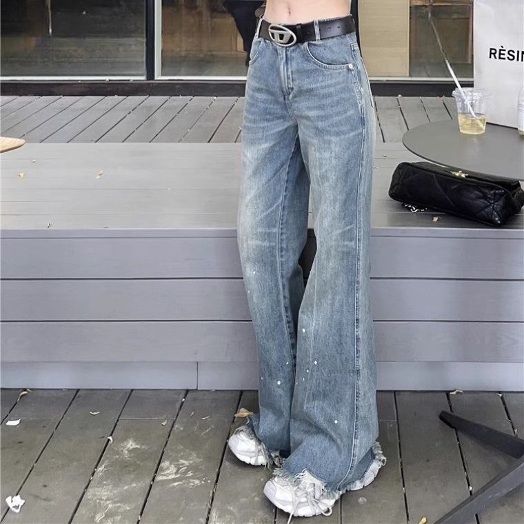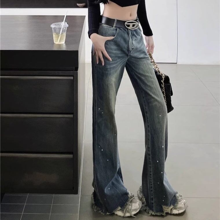 デニムパンツ レディース 韓国 ファッション クラッシュジーンズ ダメージ加工 モップパンツ ハイウエスト ブーツカットデニムパンツ