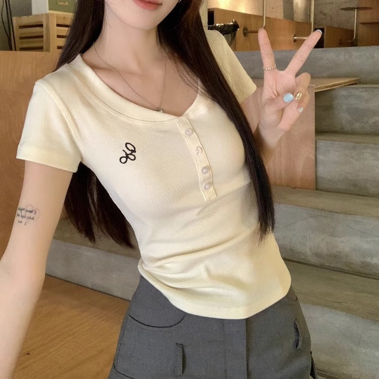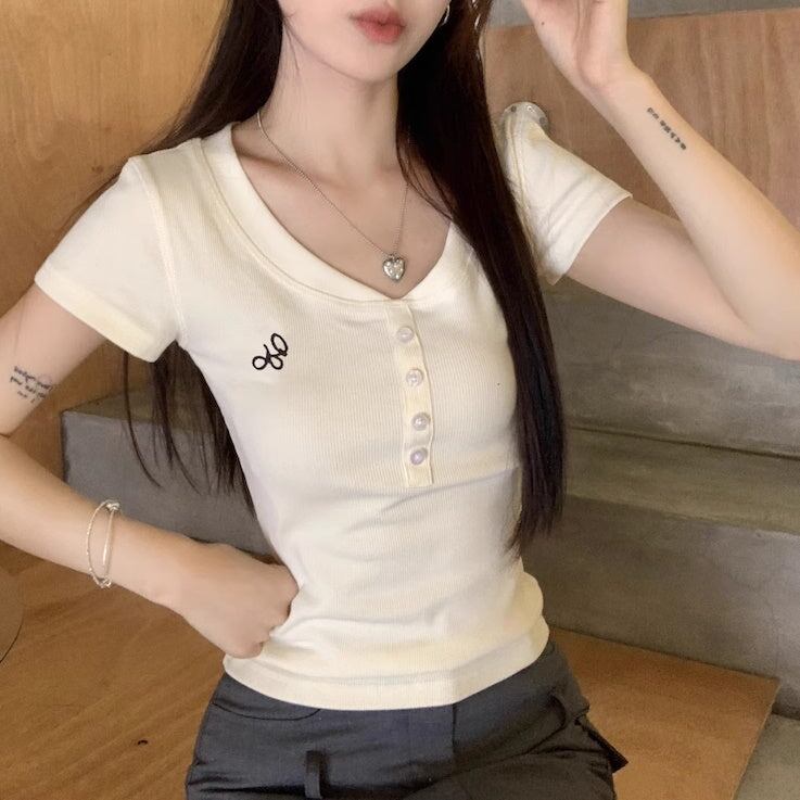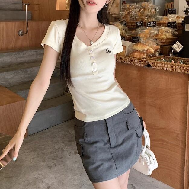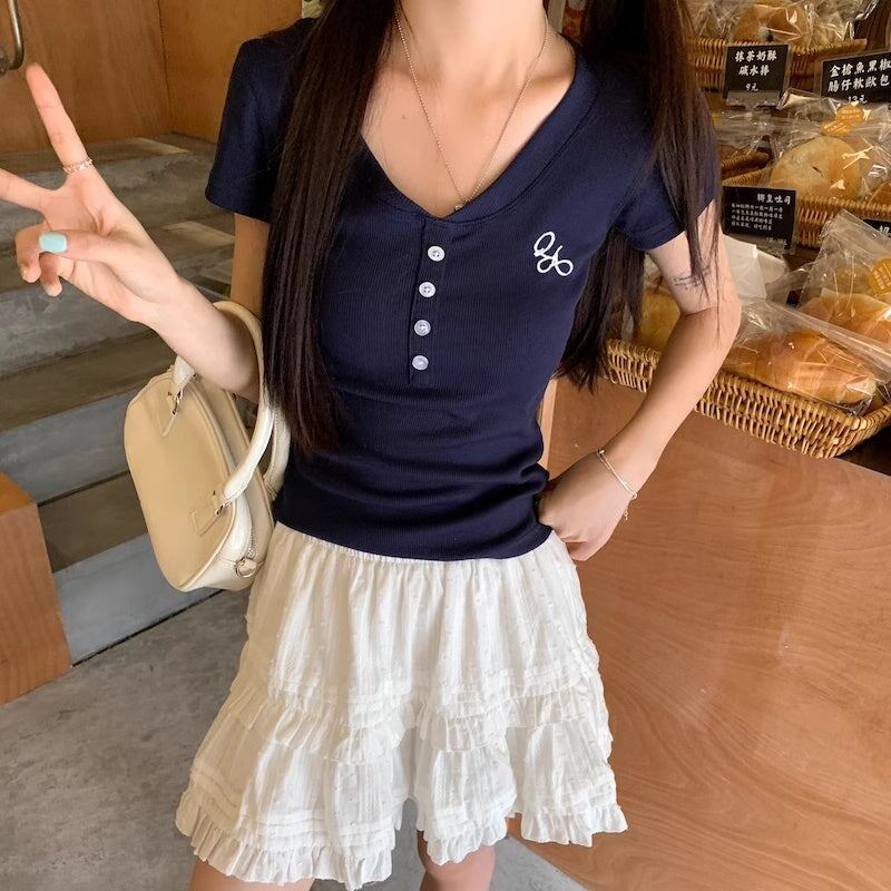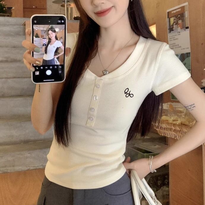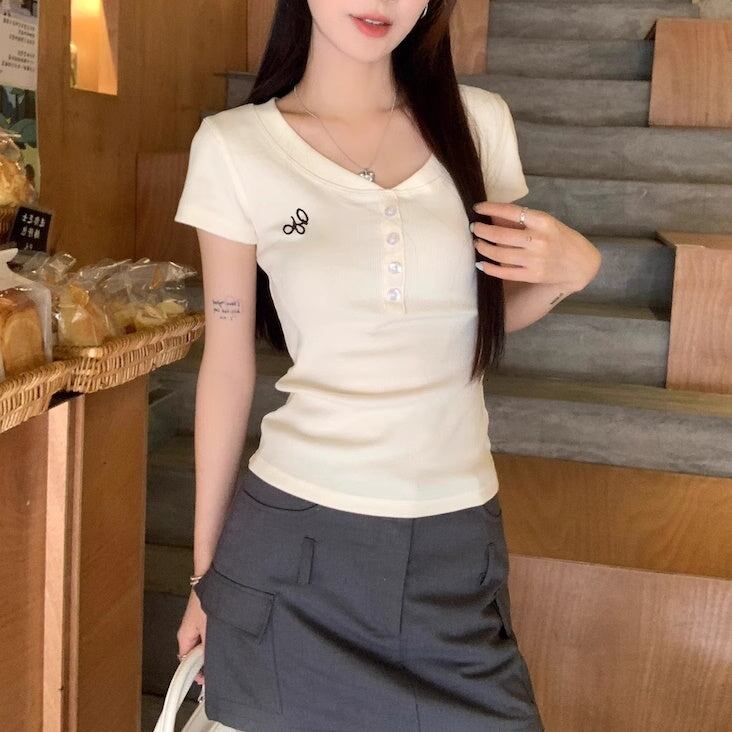 ヘンリーネック Tシャツ レディース 韓国 ファッション 夏 トップス Vネック 半袖 カットソー タイト ストレッチ T