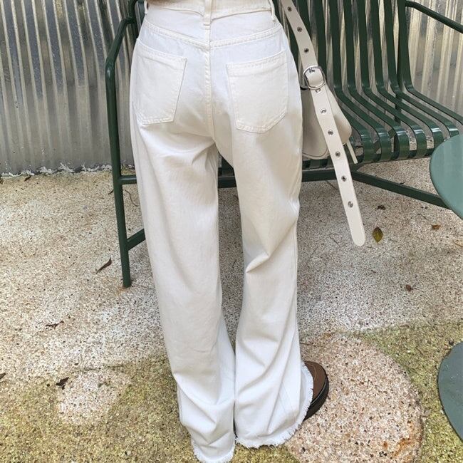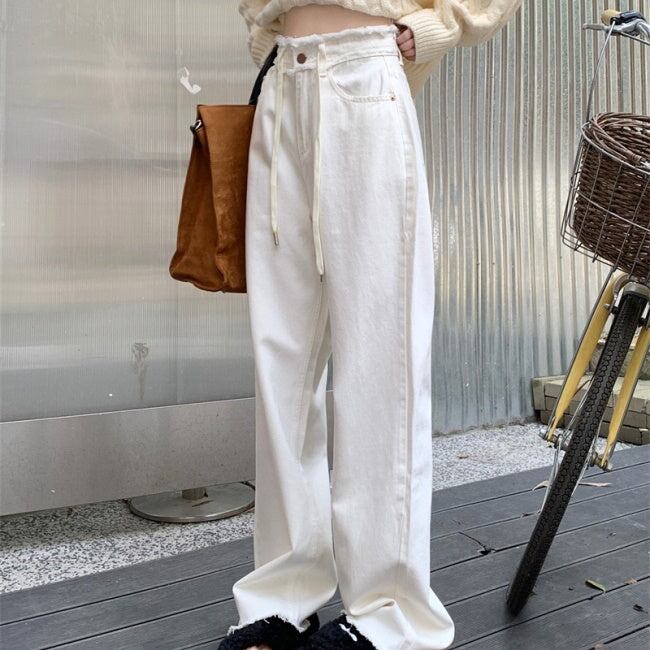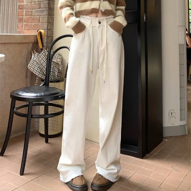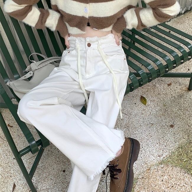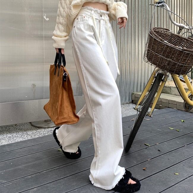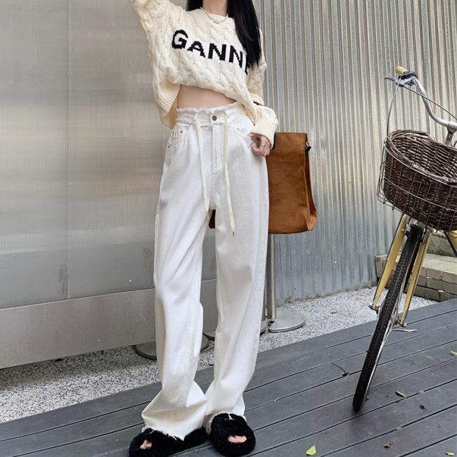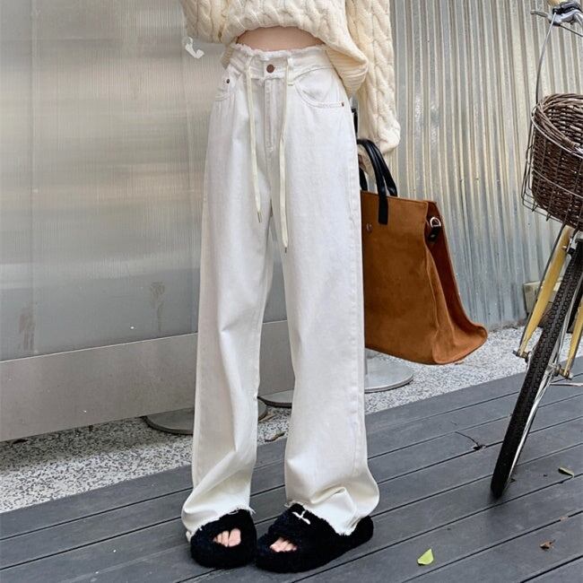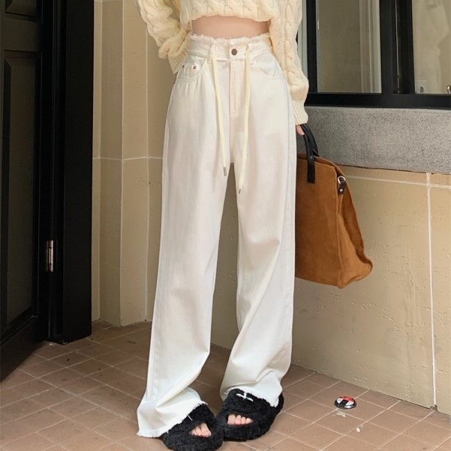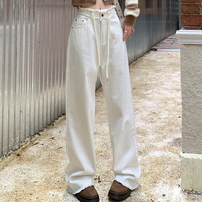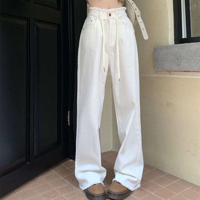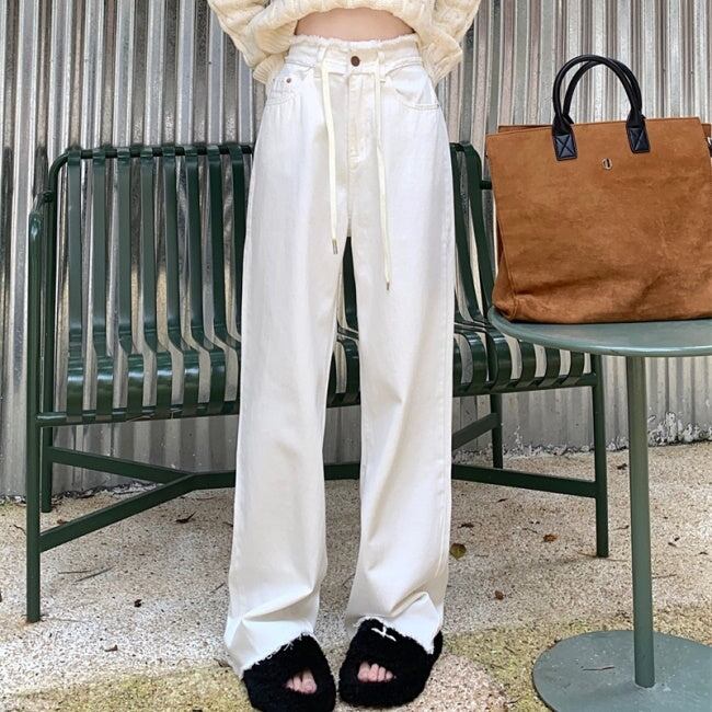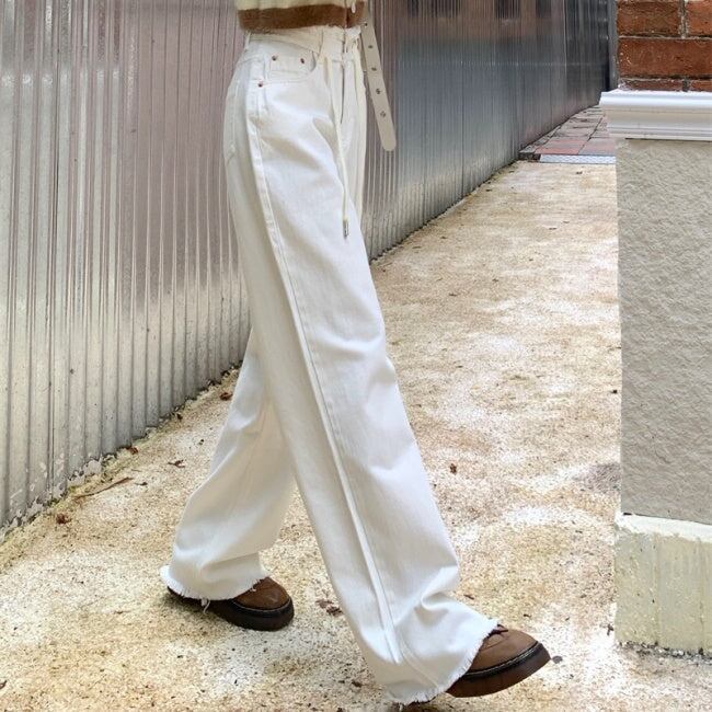 ホワイト デニム ワイドパンツ レディース 韓国 ファッション カットオフ ワイドシルエット ハイウエスト ウエストコード イージパンツ