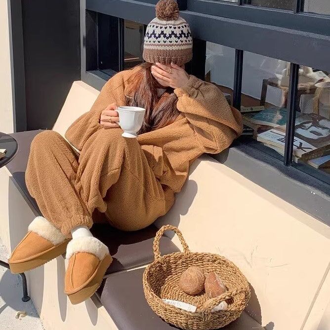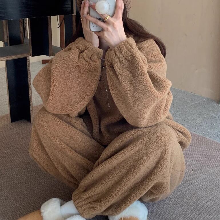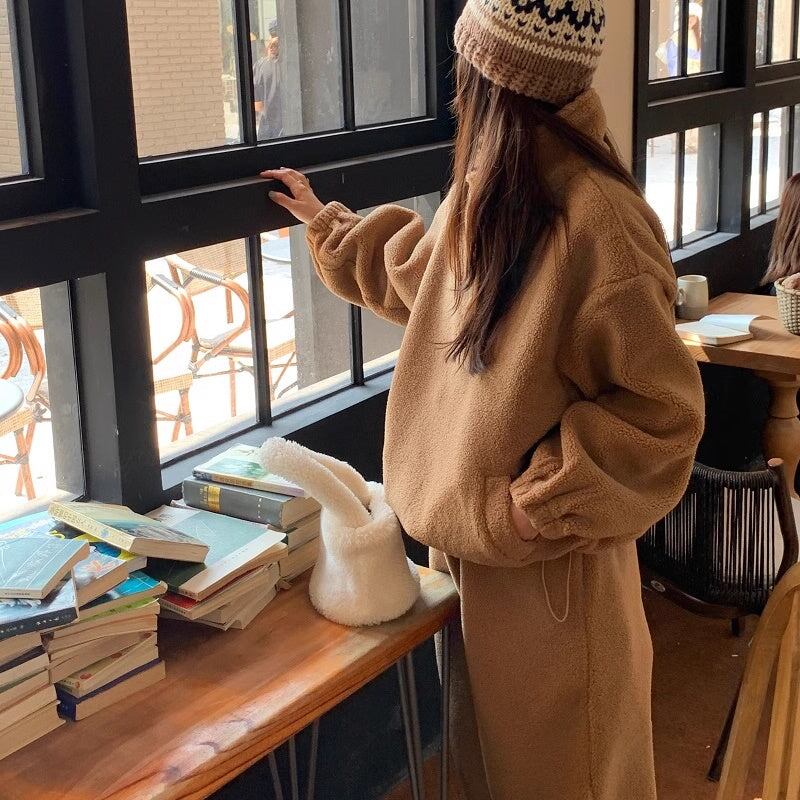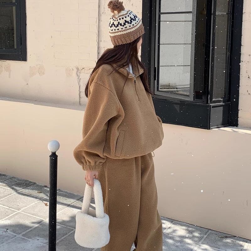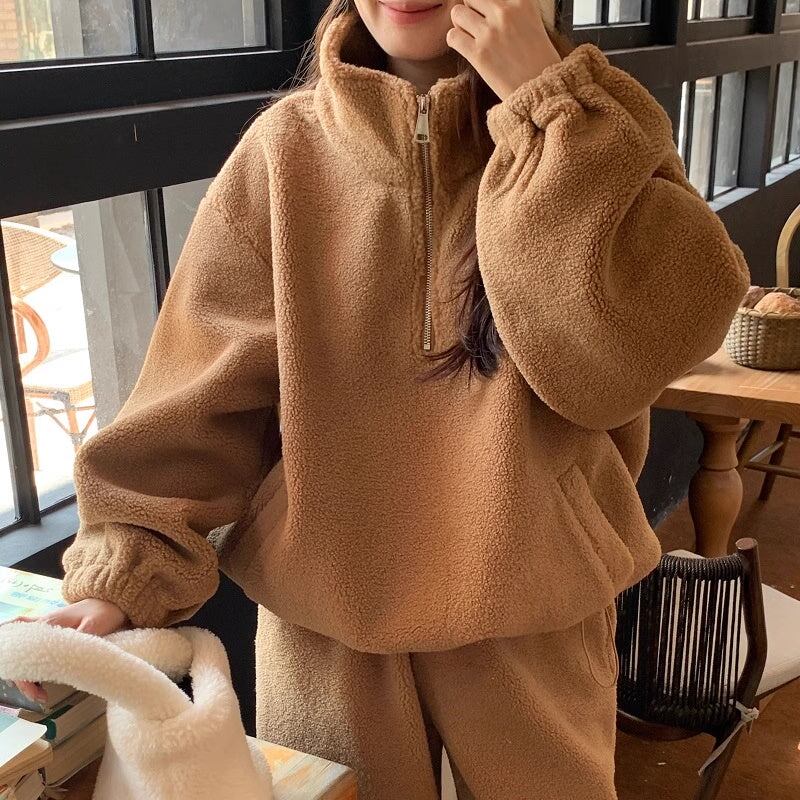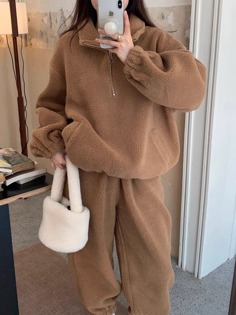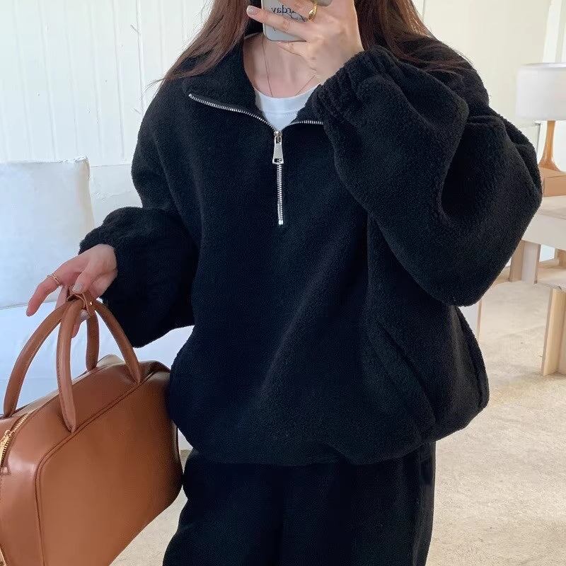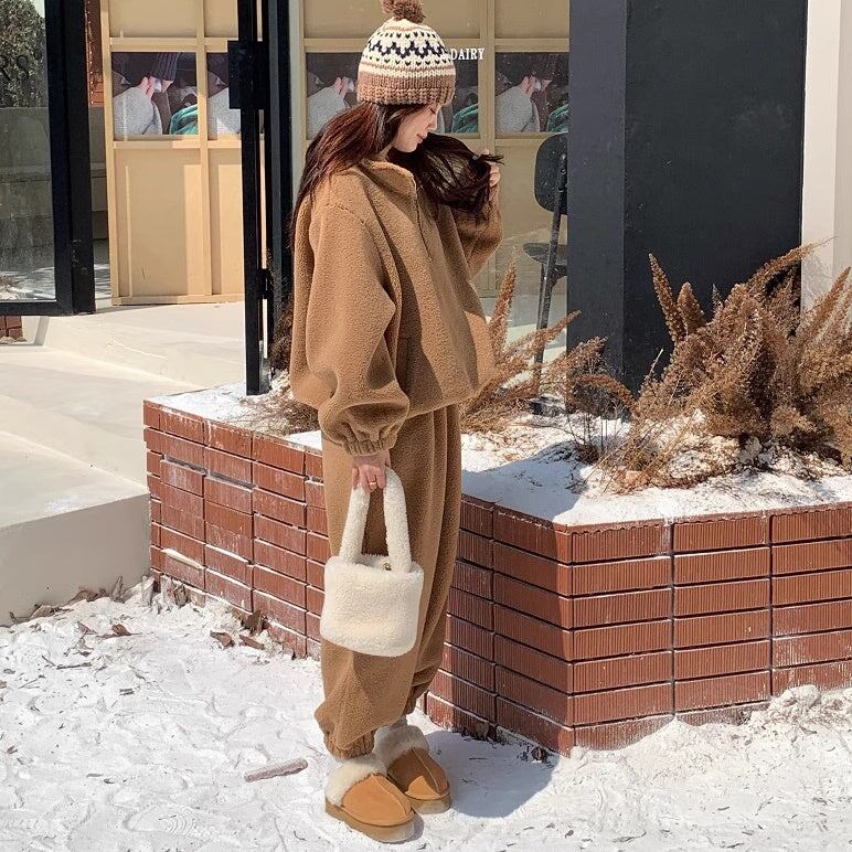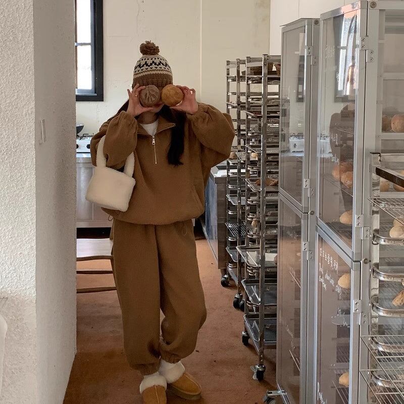 セットアップ フリース上下 レディース 韓国 ファッション ハーフジップ ジョガーバッグ ふんわり 冬ジャージ ラウンジ