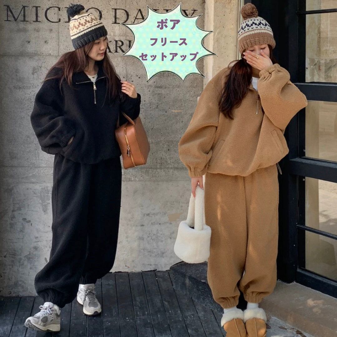 ボア セットアップ レディース 韓国 ファッション ボアフリース ハーフジップ トップス ワイドパンツ オーバーサイズ 上下セット