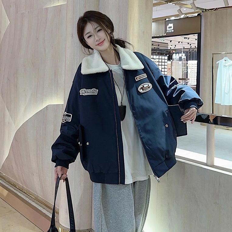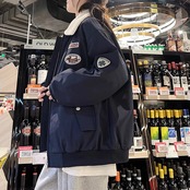 ジャケット ボア襟 レディース 韓国 ファッション ワッペン 袖ロゴ ストリート 大人カジュアル