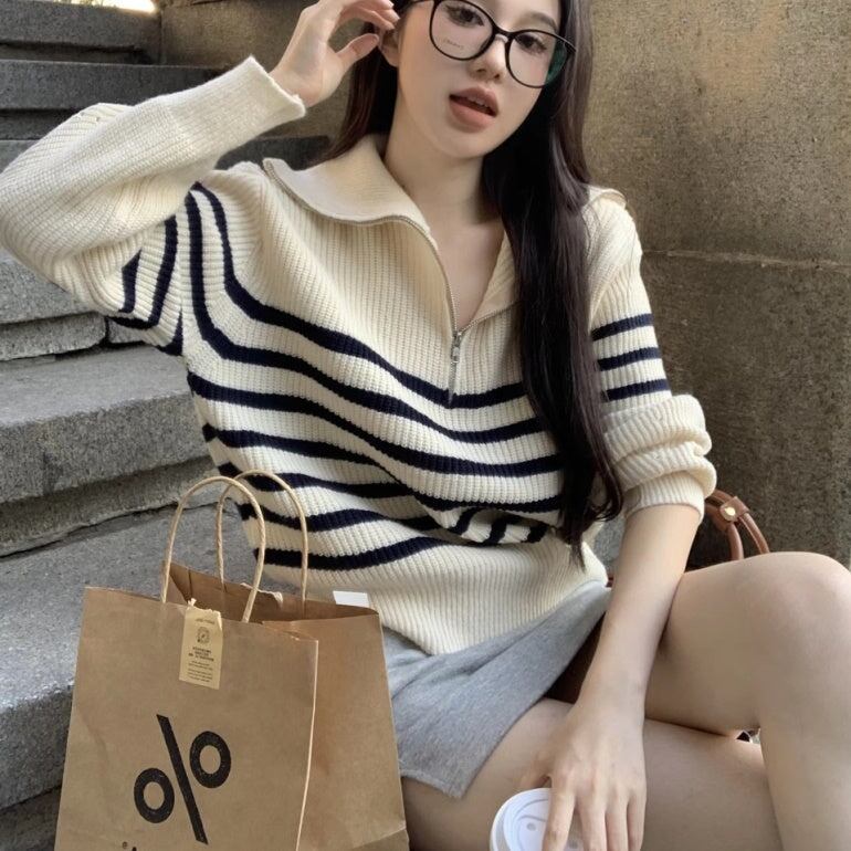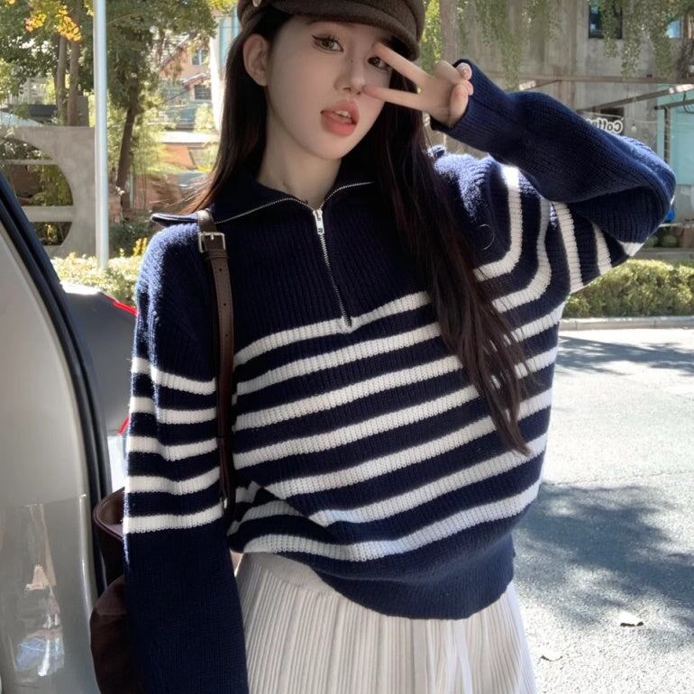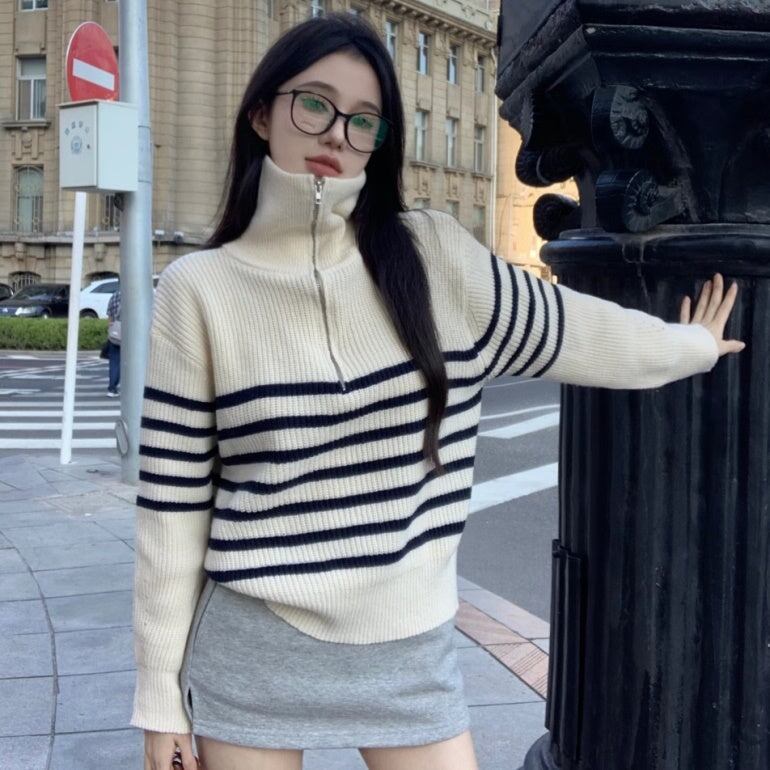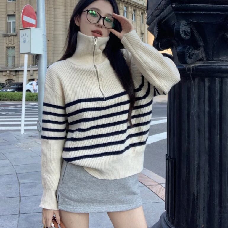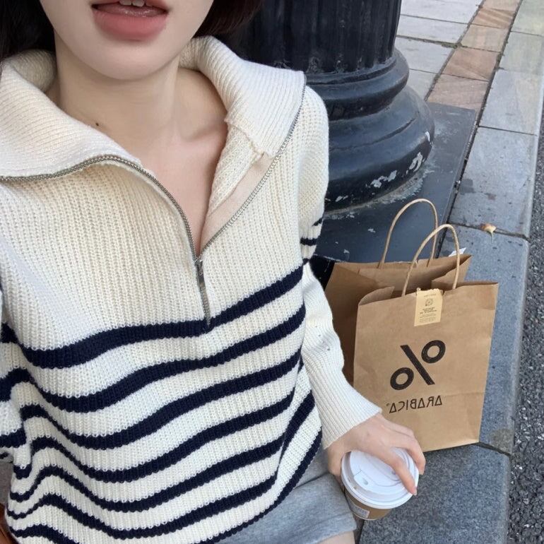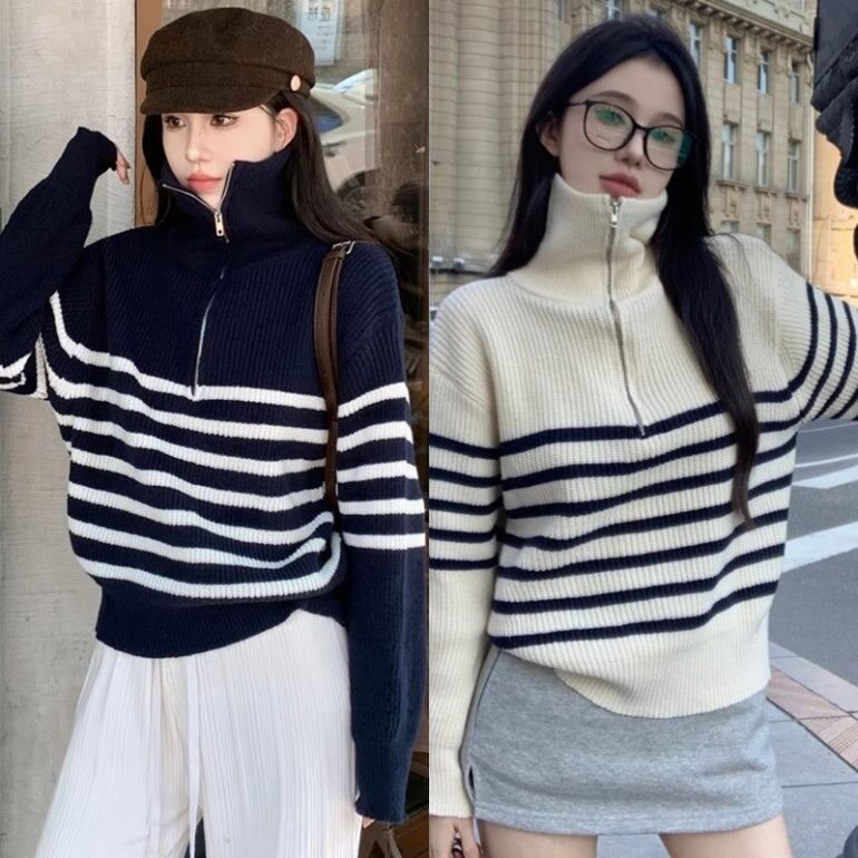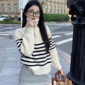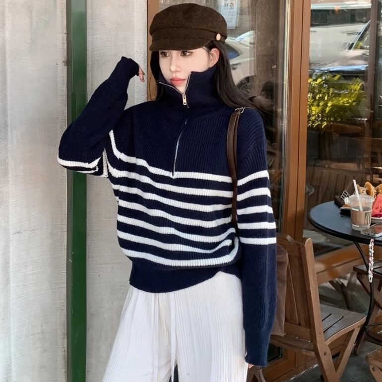 ニットボーダー レディース 韓国 ファッション ハーフジップ ニット ハイゲージ 秋冬トップス マニッシュ ストライプ