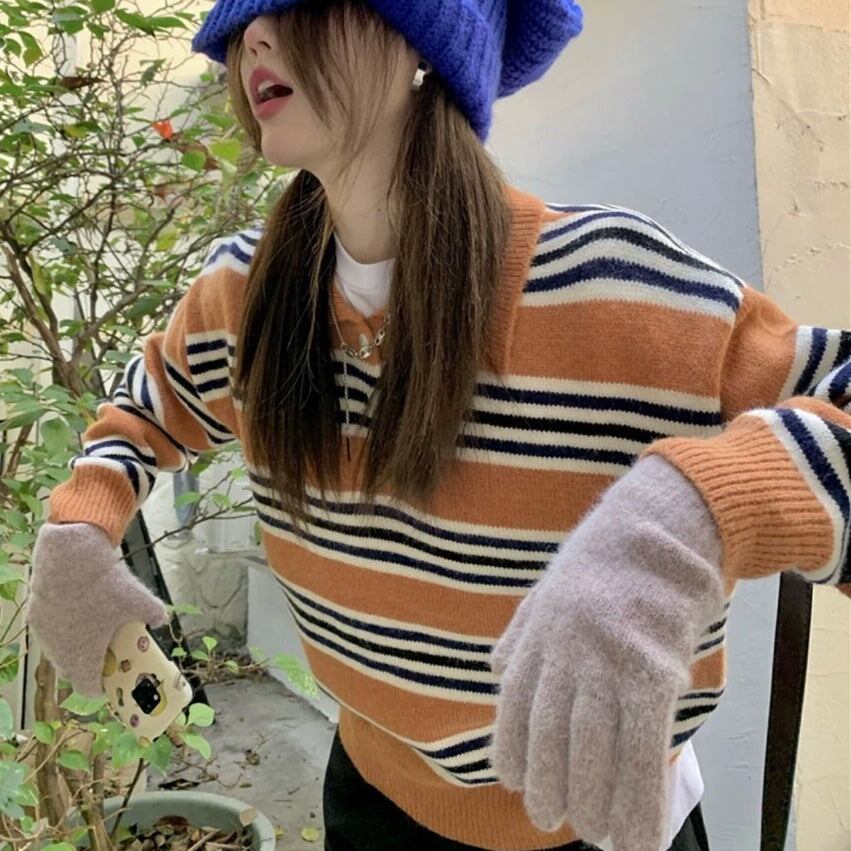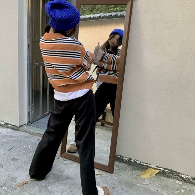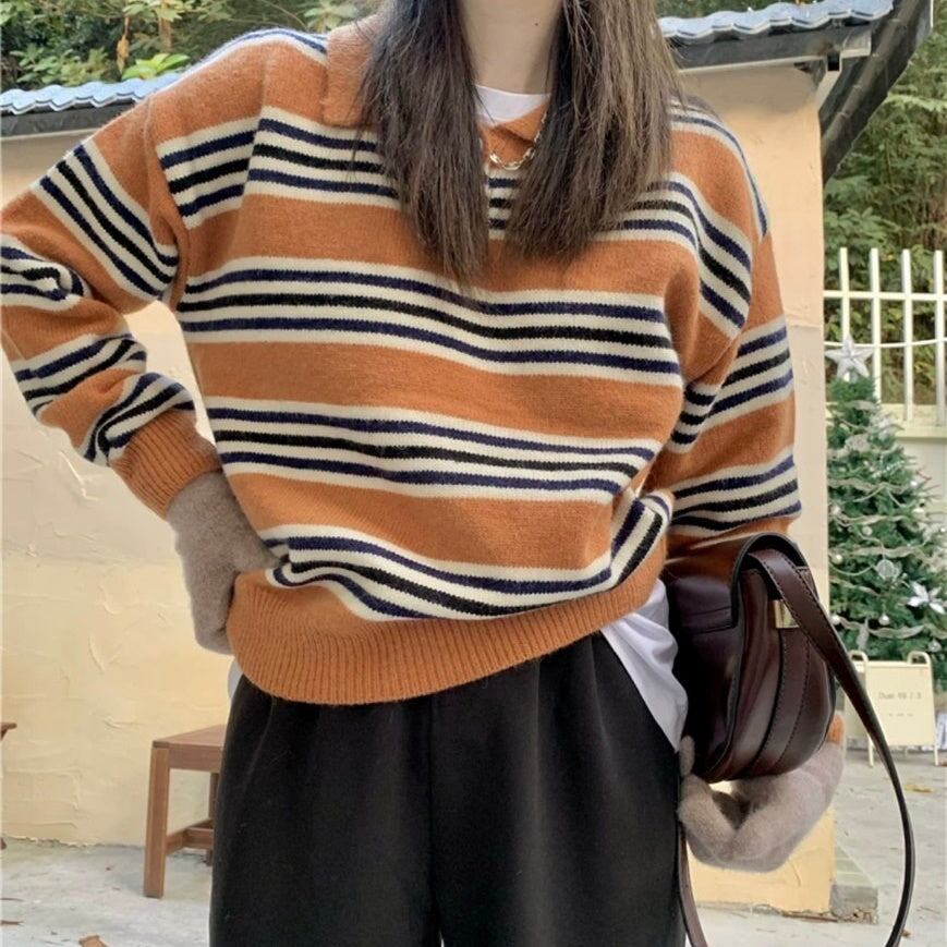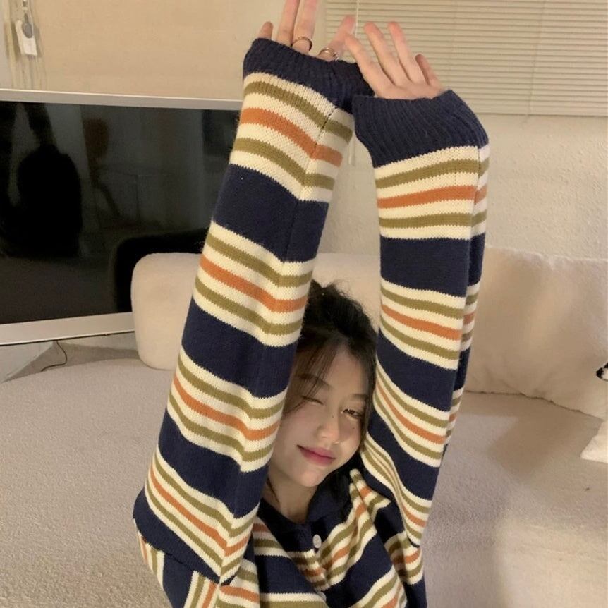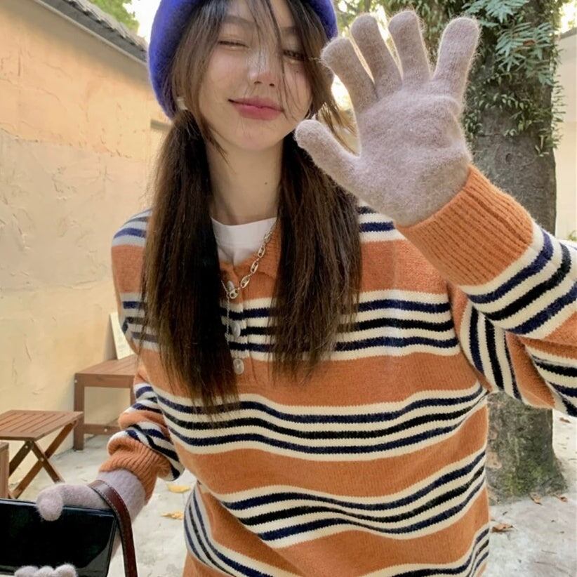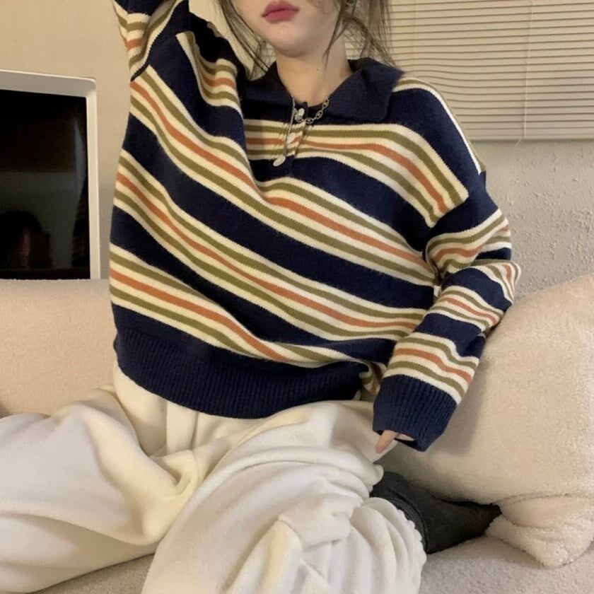 ボーダー ポロ ニット レディース 韓国 ファッション レトロ マルチボーダー プルオーバー カラフル 柄ニット