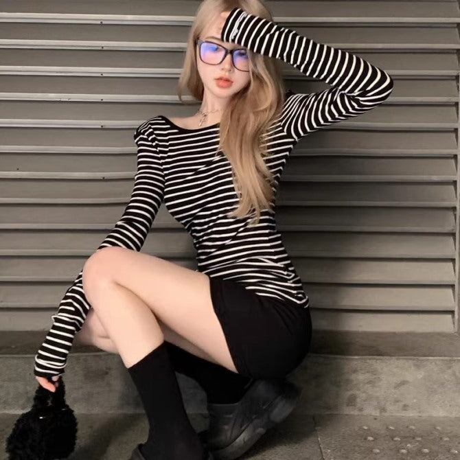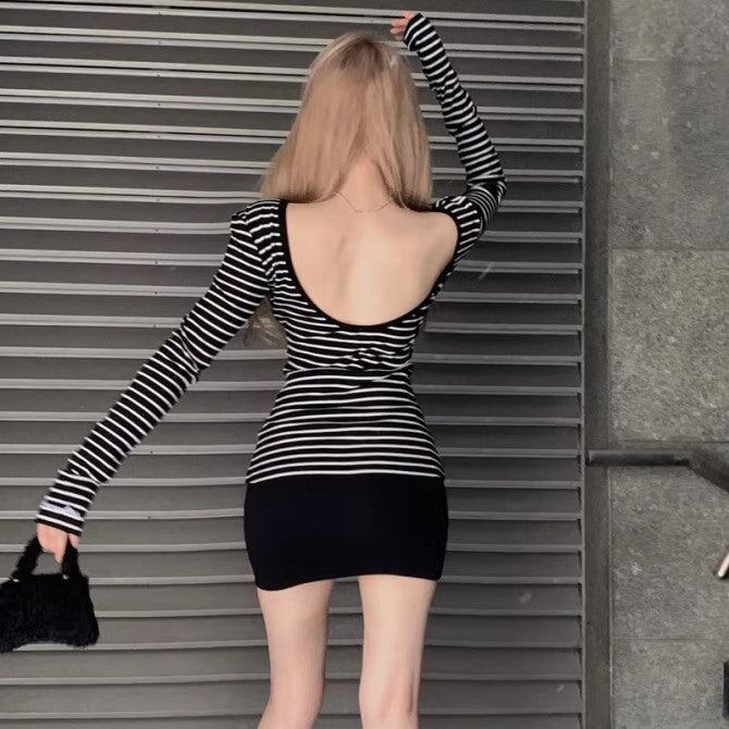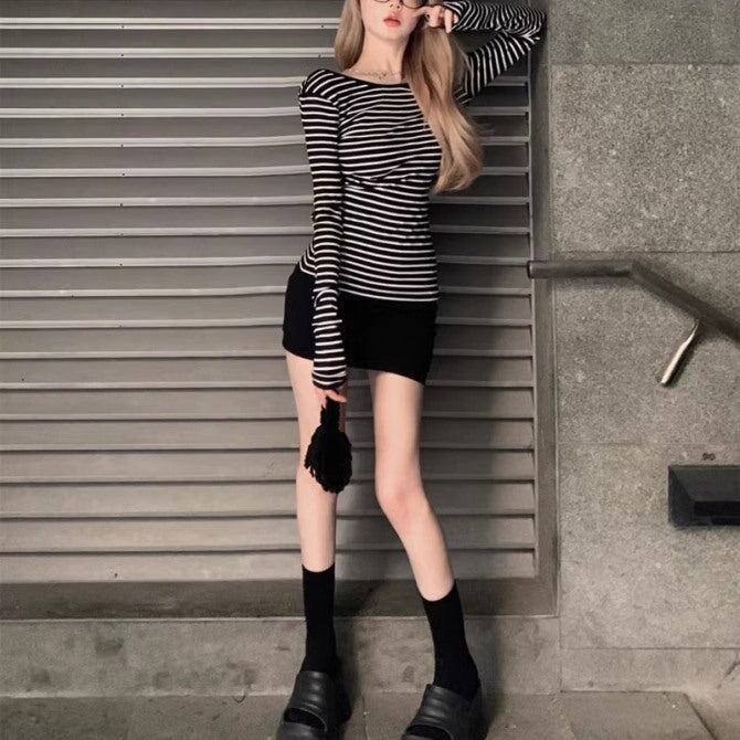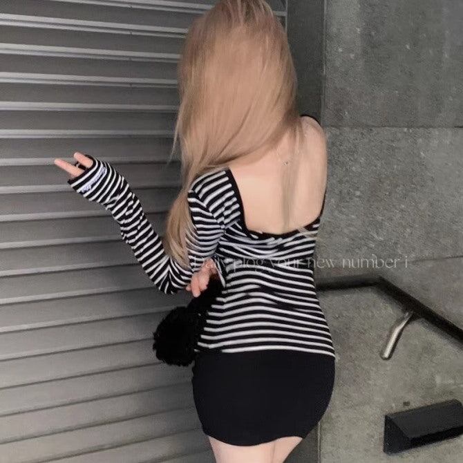 ボーダーTシャツ レディース 韓国 ファッション バックシャン 背中見せ ロング袖 カットソー 長袖 トップス