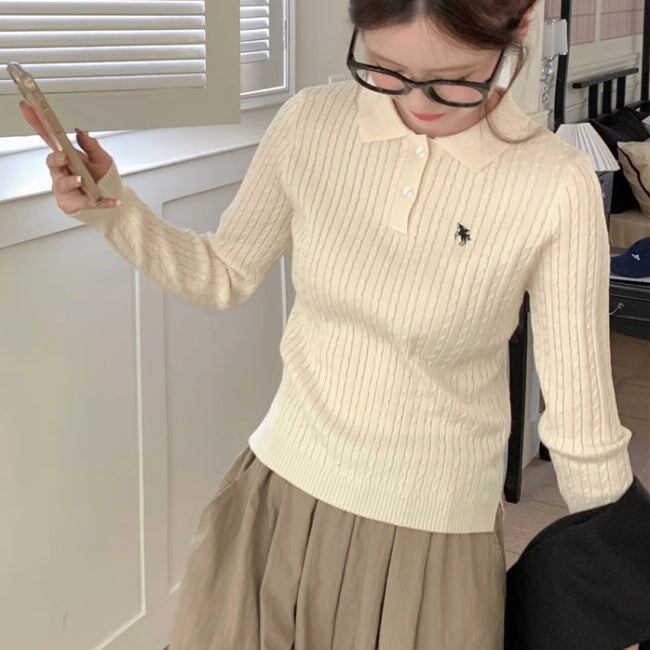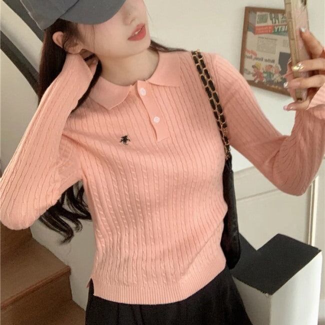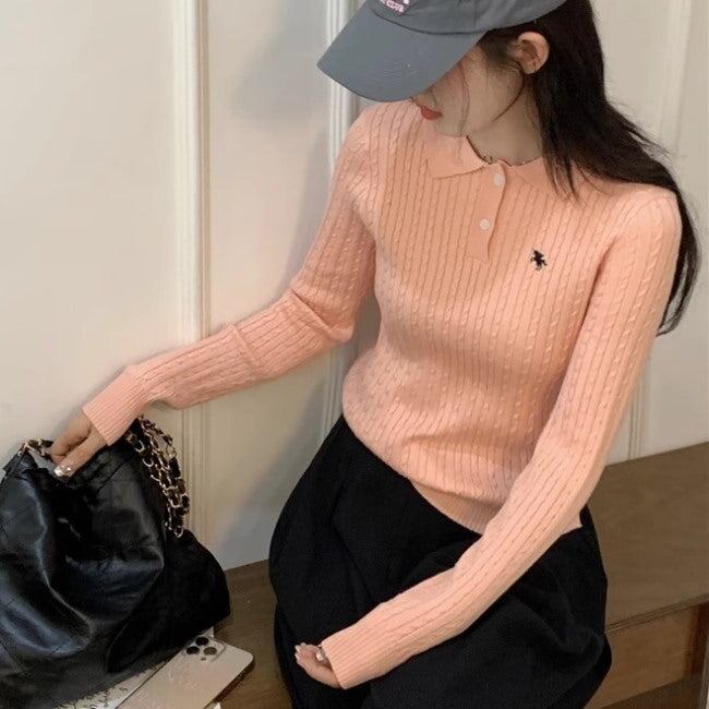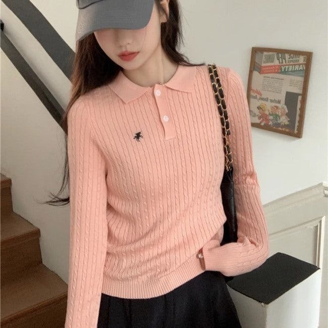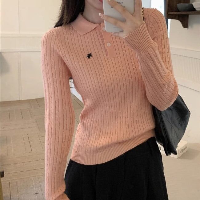 ポロ襟ニット ケーブルニット レディース 韓国 ファッション タイトフィット 秋トップス 薄手ニット ポロシャツ