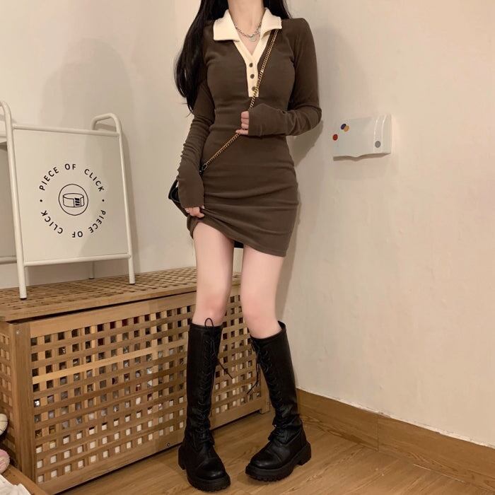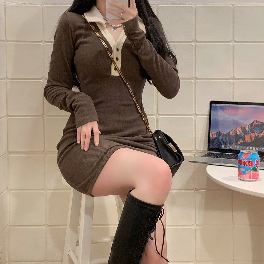 タイトワンピース ポロ襟 レディース 韓国 ファッション ストレッチ タイト フィット バイカカラー カットソー ミニワンピース 長袖