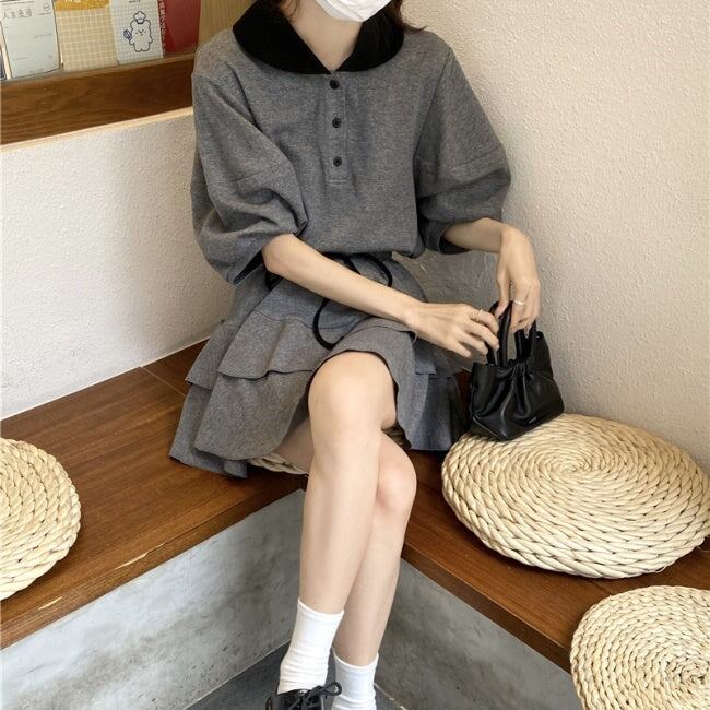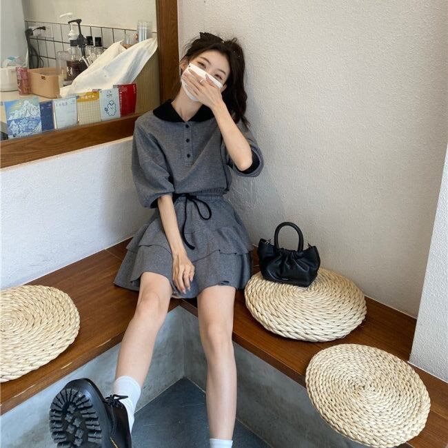 セットアップ? ポロ襟 フレアミニ レディース 韓国 ファッション ガーリー 夏上下 2点セット Tシャツ ティアードスカート フレアスカート バイカラー