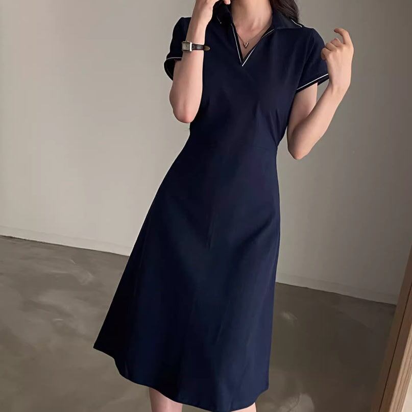 ポロワンピース フレア 韓国 ファッション スキッパー Aライン バックリボン Vネック ひざ下丈 ロングワンピース