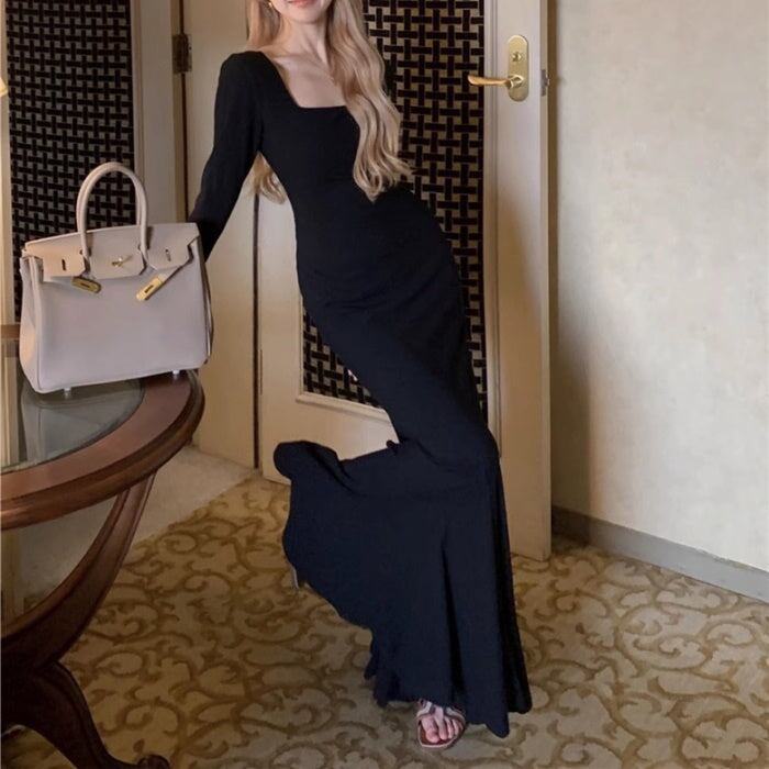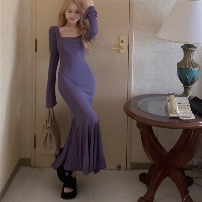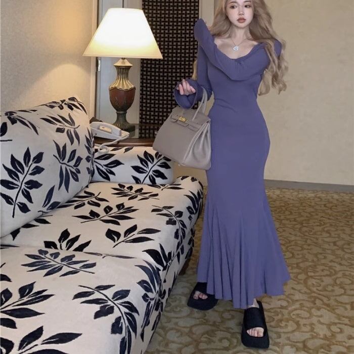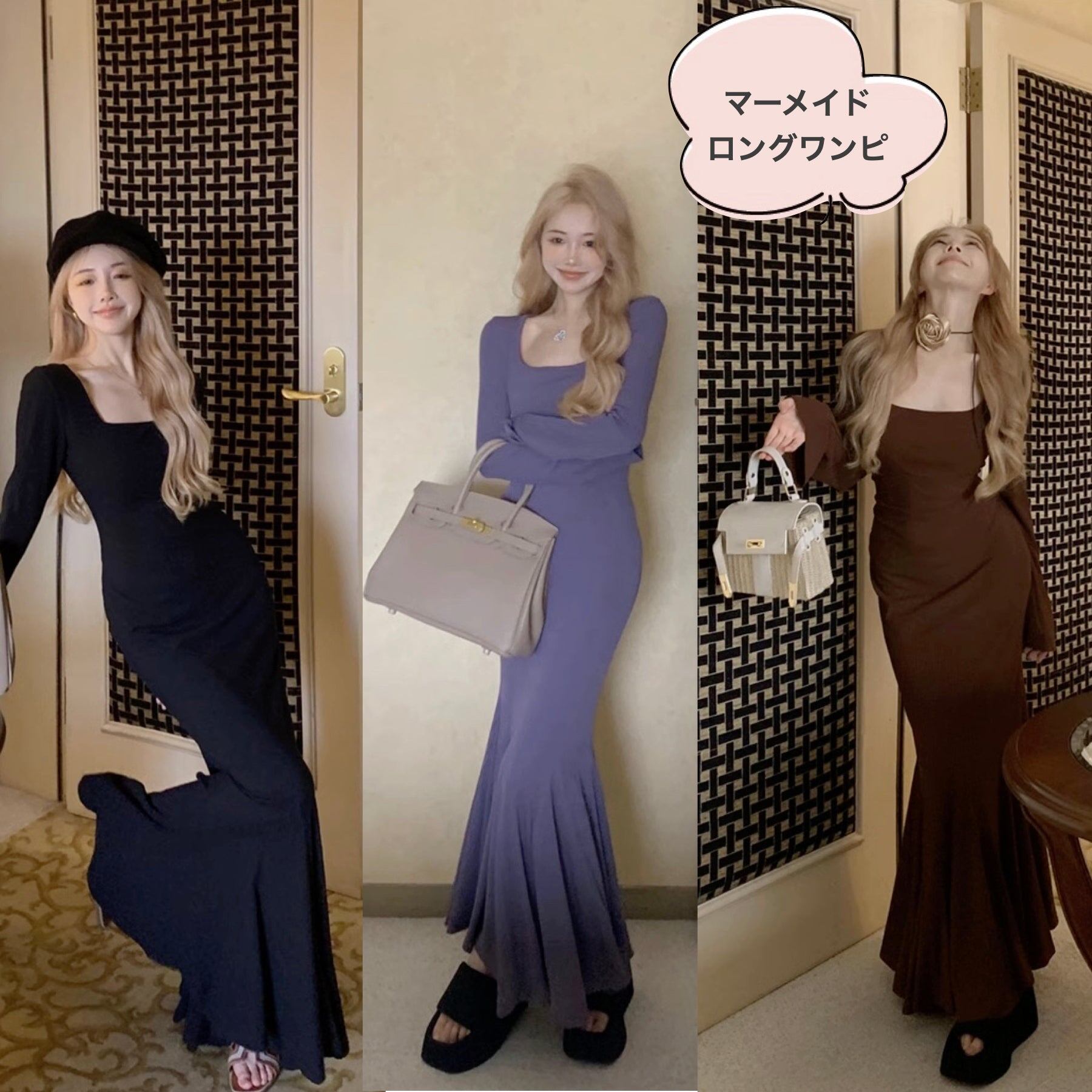 マーメイド ワンピース 韓国 ファッション デコルテ 長そで ロング フレアワンピ 長そで カットソー ワンピース タイトフィット
