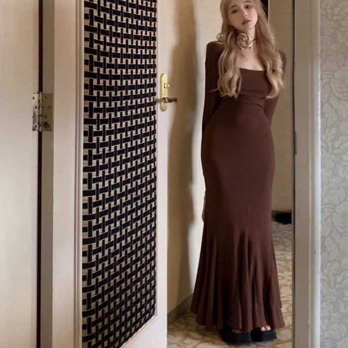 マーメイドワンピース レディース 韓国 ファッション デコルテ 長そで ロング フレア ワンピ マキシ 長そでワンピース タイトフィット
