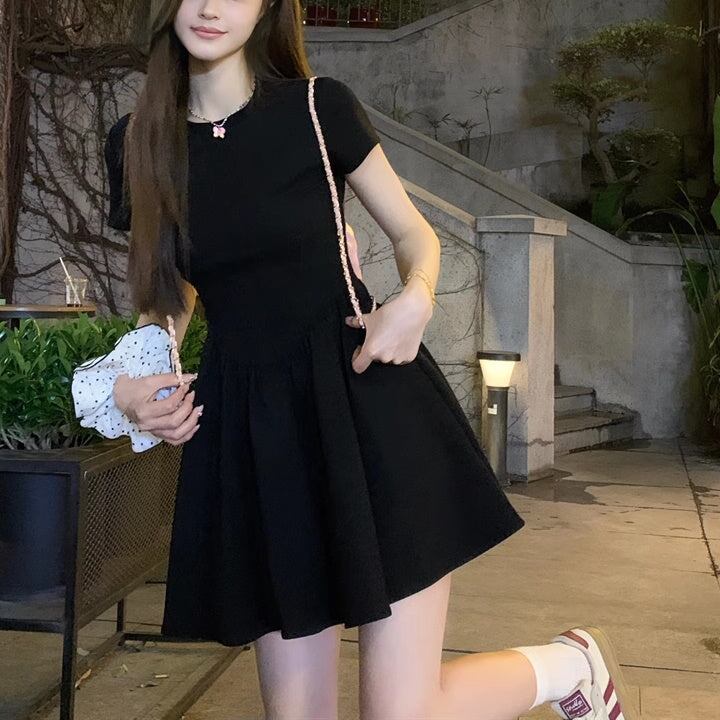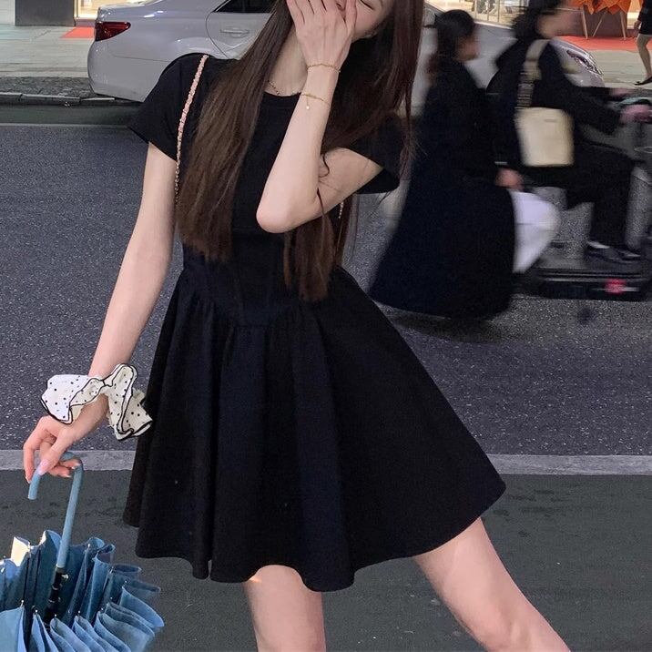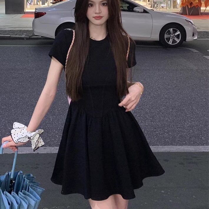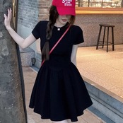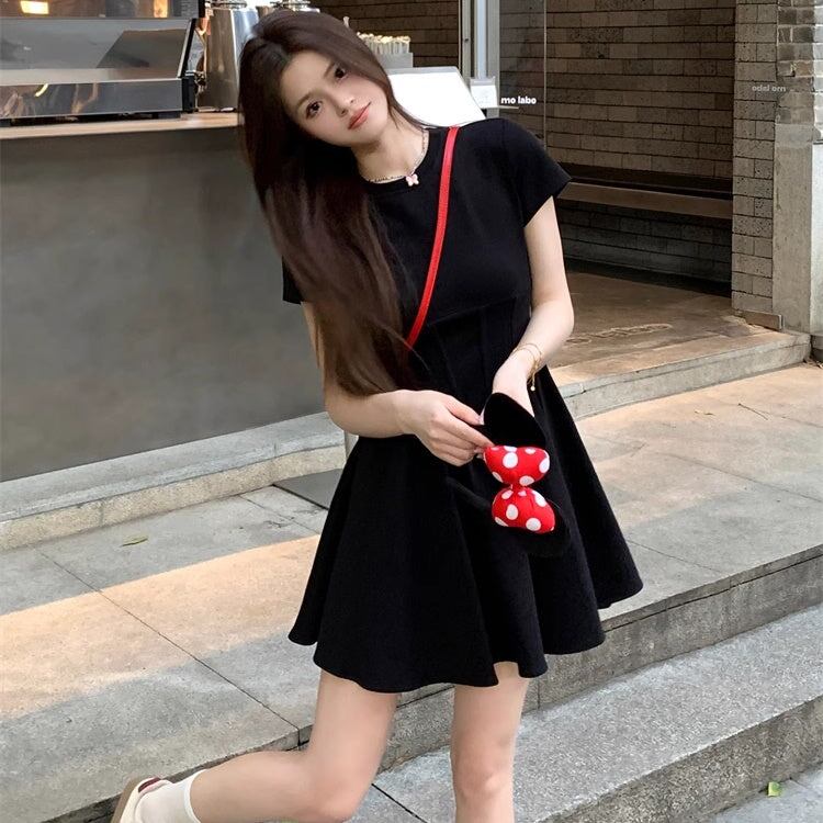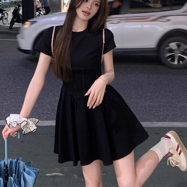 ワンピース 黒 レディース 韓国 ファッション フレア Tシャツ 半袖 ドッキング 切り替えワンピ ミニワンピ シック ガーリー