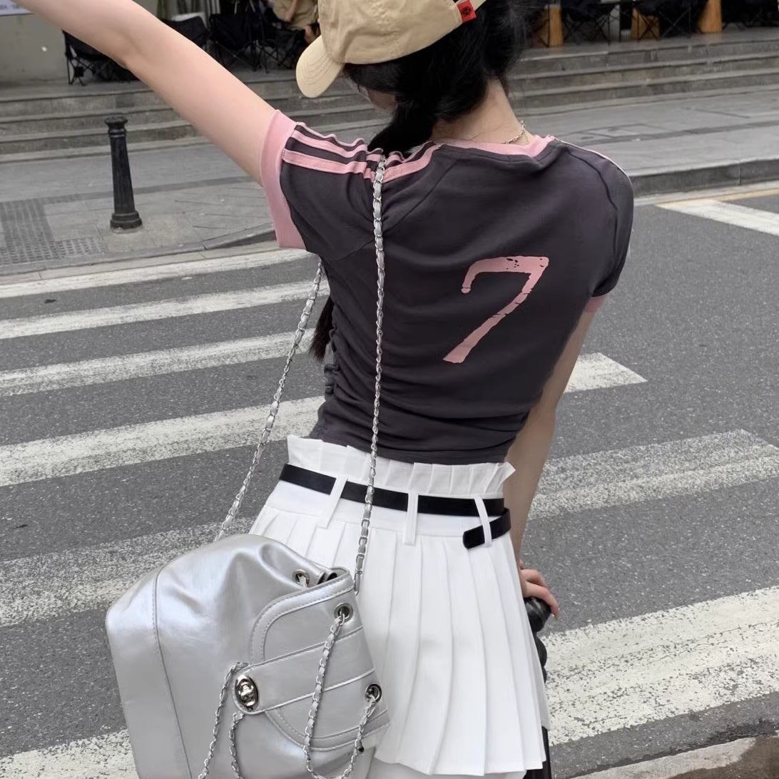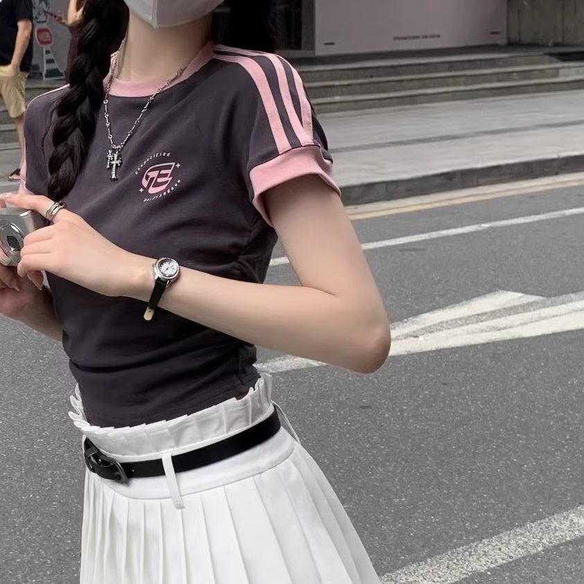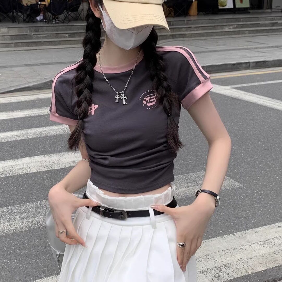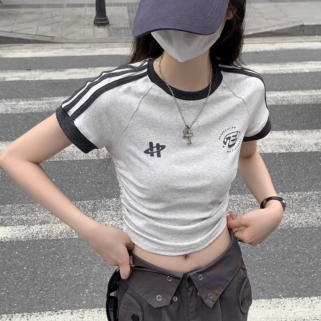 ライン Tシャツ レディース 韓国 ファッション クロップドT シャーリング リンガーtシャツ ロゴマーク 肩ライン スポーティー