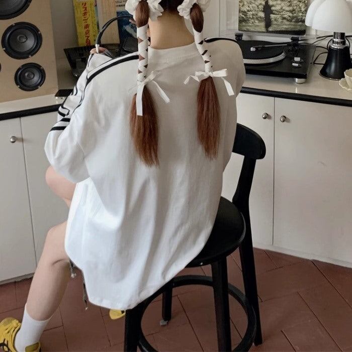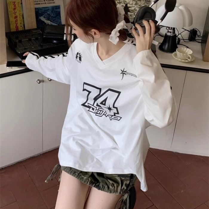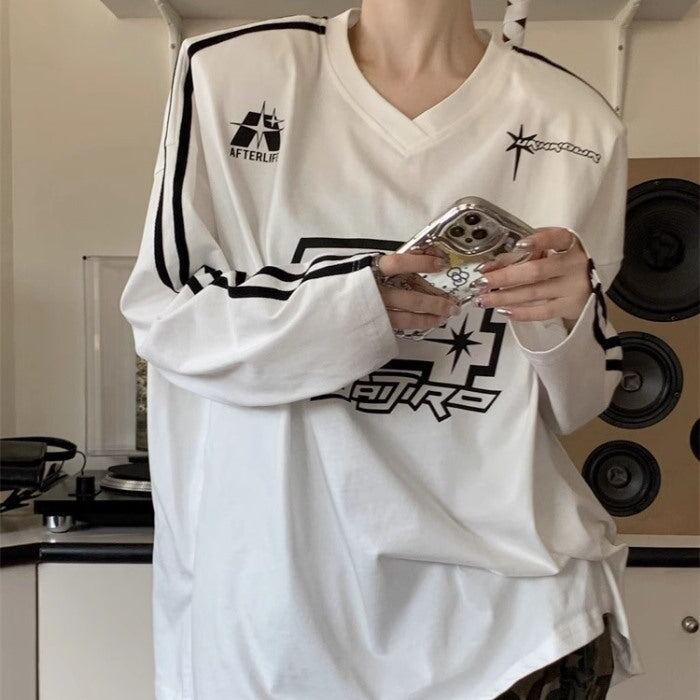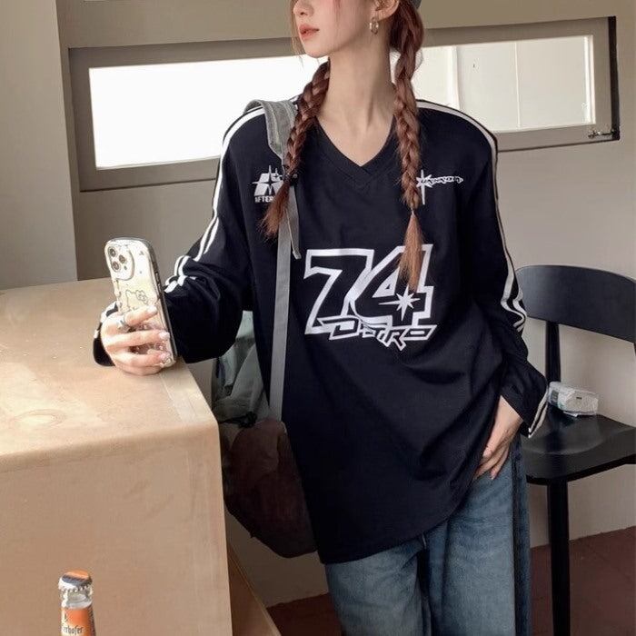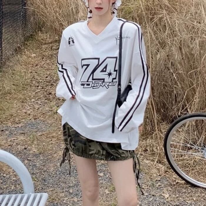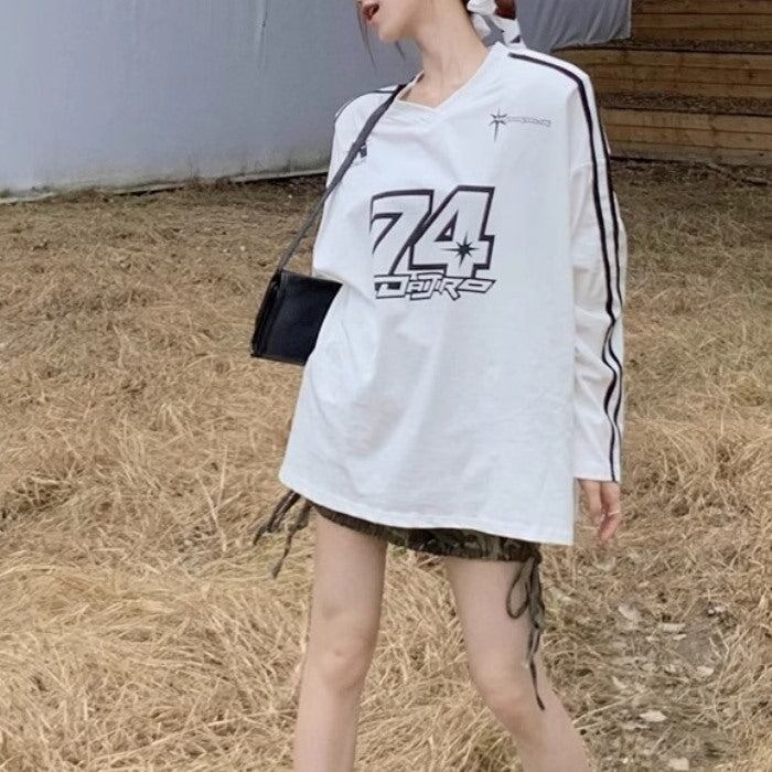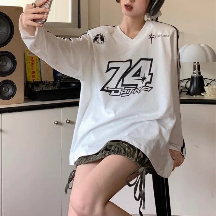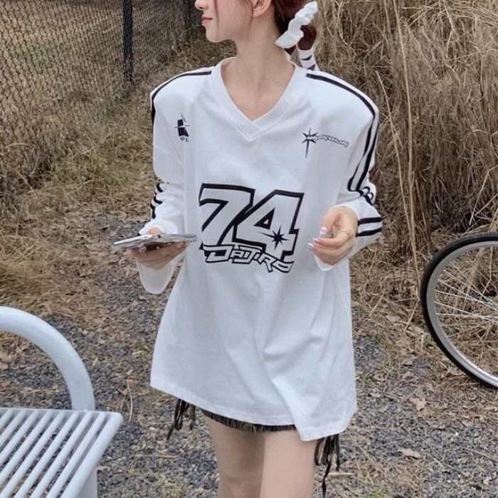 ライン グラフィック ロンT レディース 韓国 スポーティ ロングTシャツ ナンバー ロゴ 袖ライン オーバーサイズ