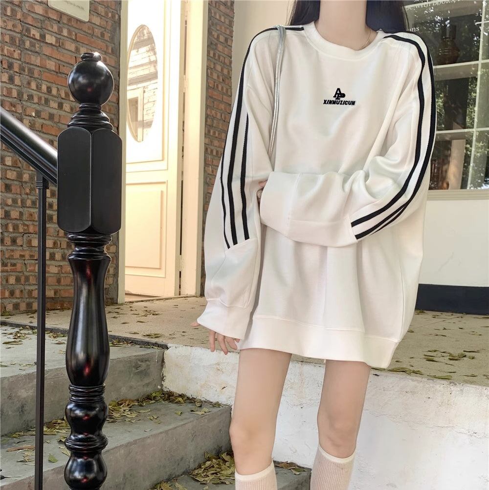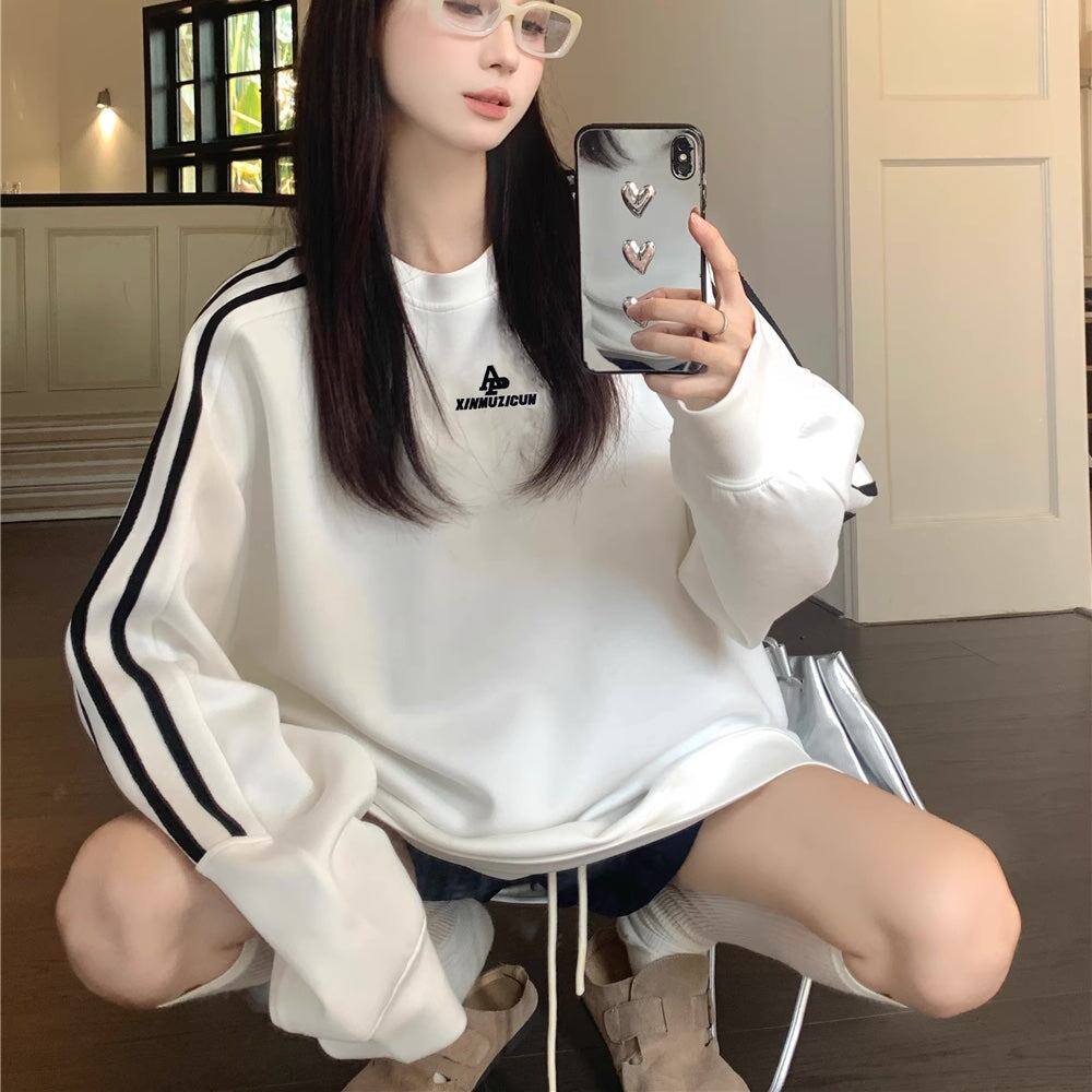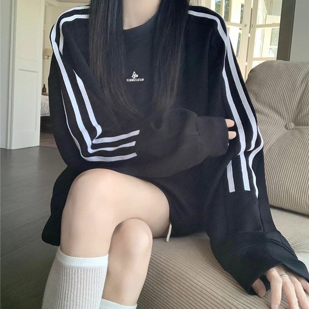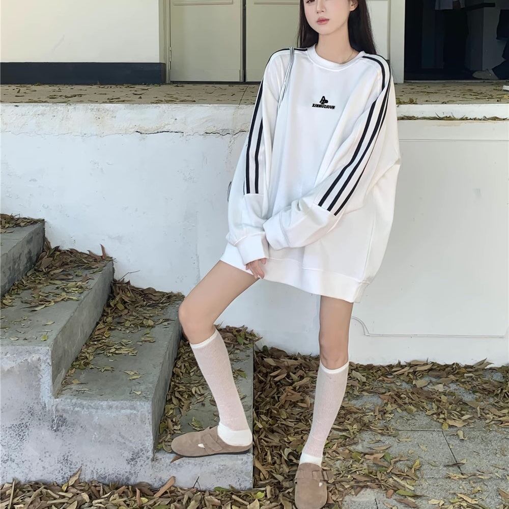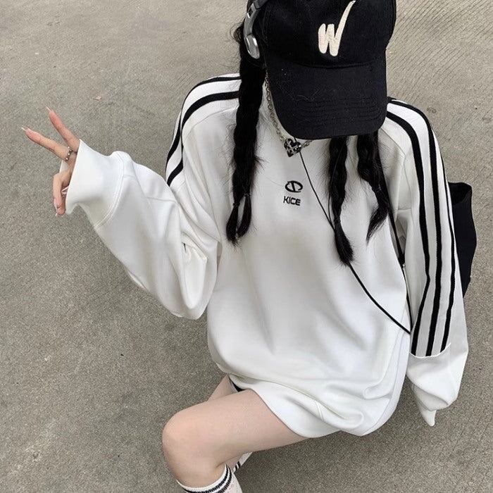 スウェット トレーナー レディース 韓国 ファッション 裏起毛? 袖ライン ロゴ プリント モノトーン ライン スポーツ 男女兼用 ビッグシルエット オーバーサイズ