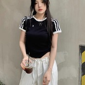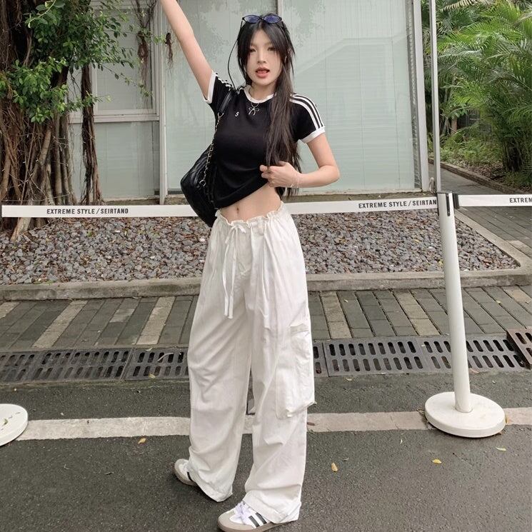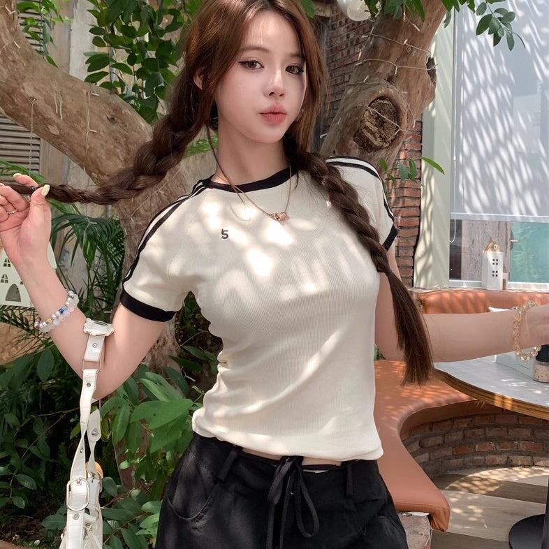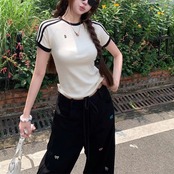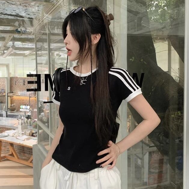 ライン チビ Tシャツ レディース 韓国 ファッション クロップ スポーティー tシャツ ストレッチ 夏 トップス