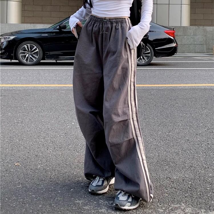 ライン ナイロンパンツ レディース 韓国 ファッション サイドライン パラシュート パンツ ワイド