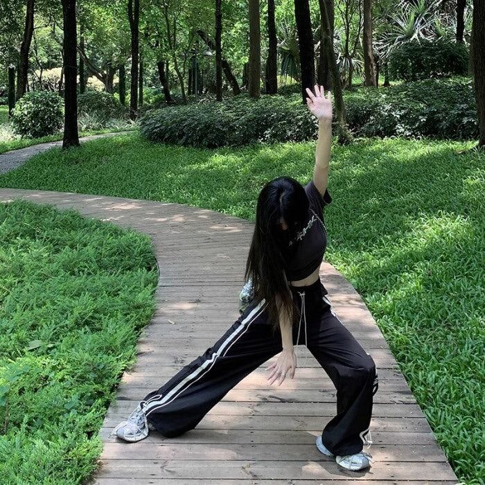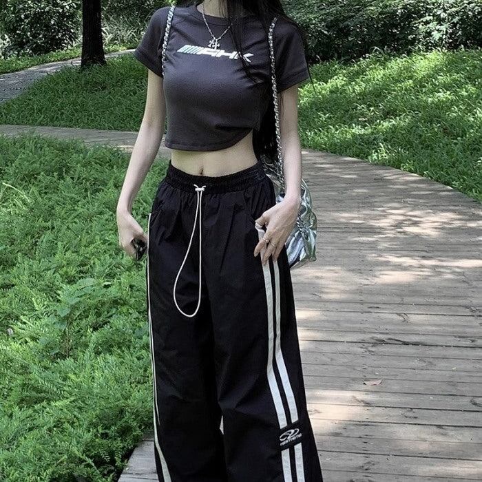 クロップTシャツ パンツ セットアップ レディース 韓国 ファッション 2点セット 上下セット ミニマム ボリュームパンツ サイドライン シャカパン ミニT タイトT