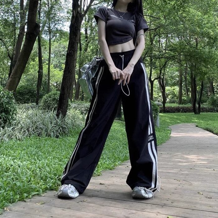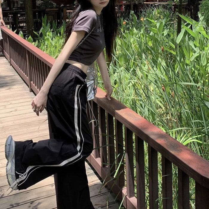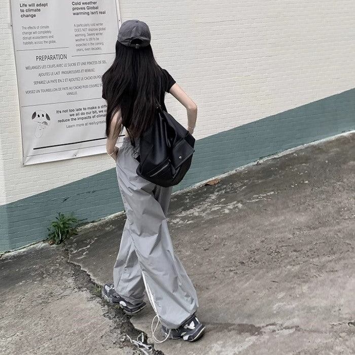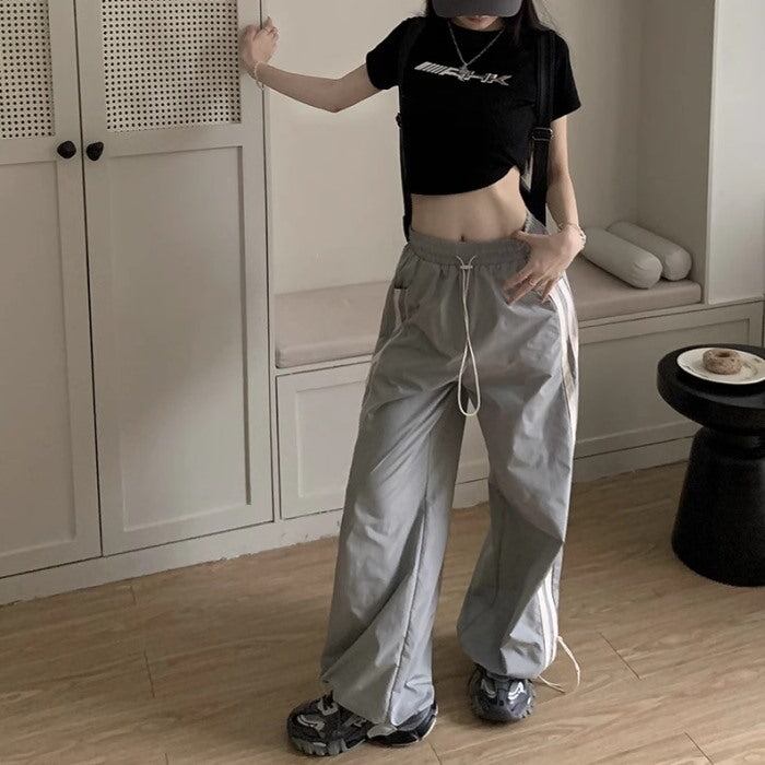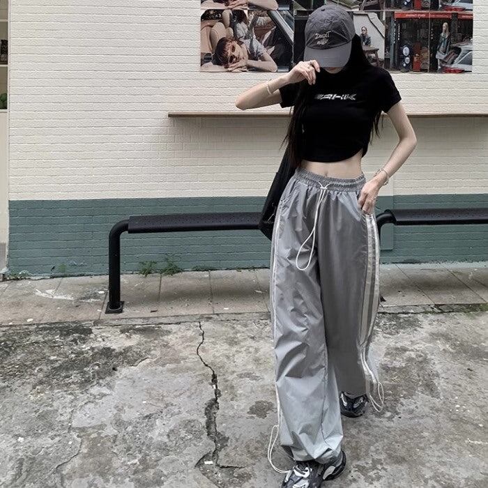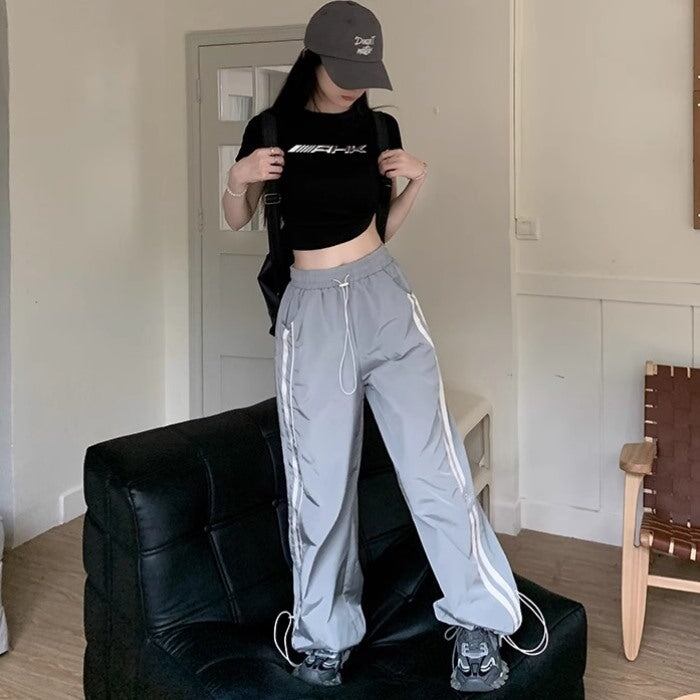 ライン パラシュートパンツ 韓国 ファッション レディース スポーツ ストリート ナイロン ワイドパンツ
