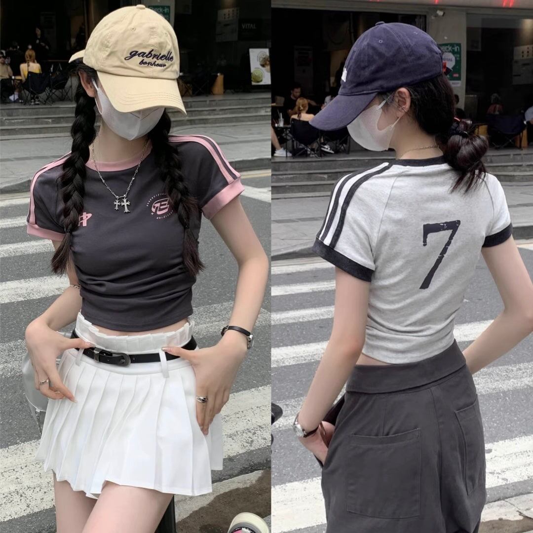 Tシャツ ナンバーロゴ レディース 韓国 ファッション リンガーT バックプリント ワンポイント ロゴT ショート丈 クロップド