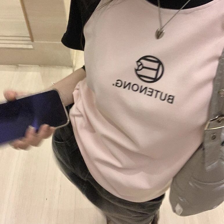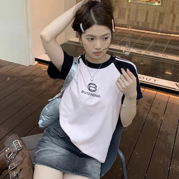 Tシャツ リンガー ラグラン レディース 韓国 ファッション フロントロゴマーク モノトーン 夏トップ